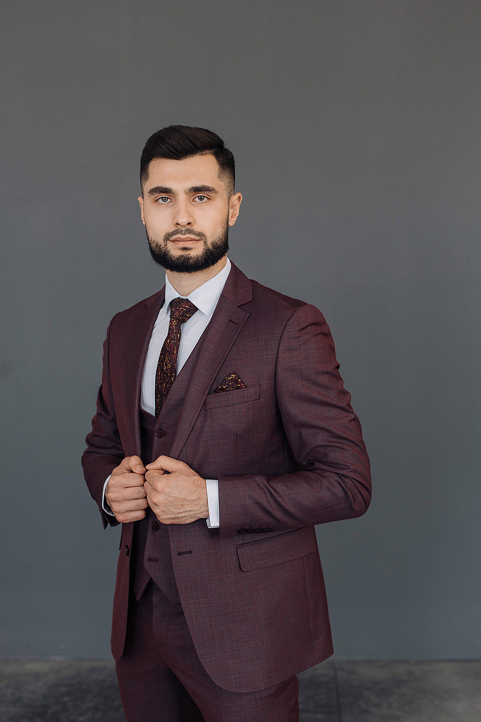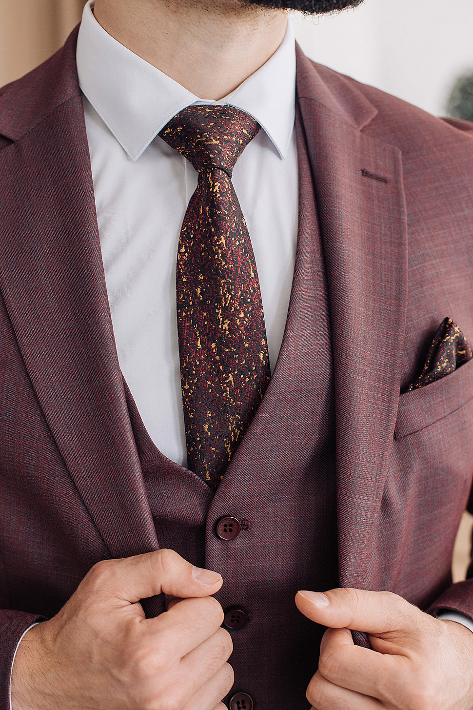 Мужской костюм тройка бордового цвета фактурный