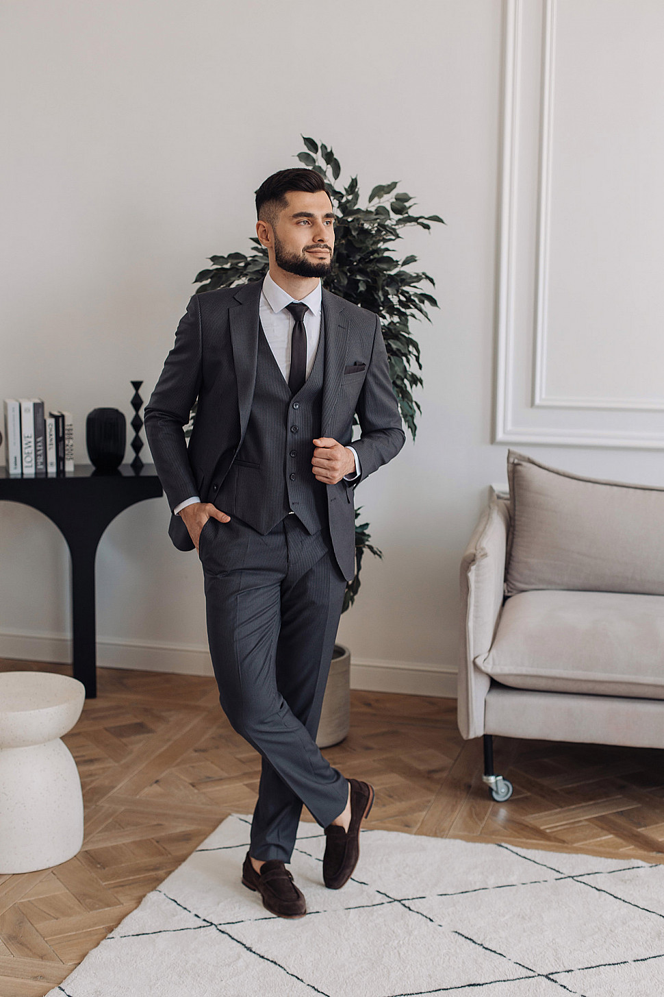 Мужской костюм тройка серого цвета фактурный