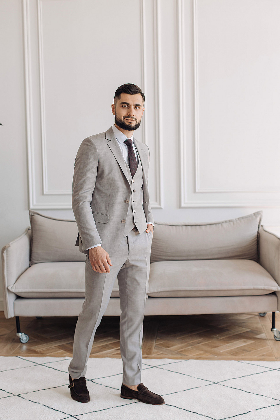Мужской костюм двойка серого цвета в мелкую клетку с накладными карманами