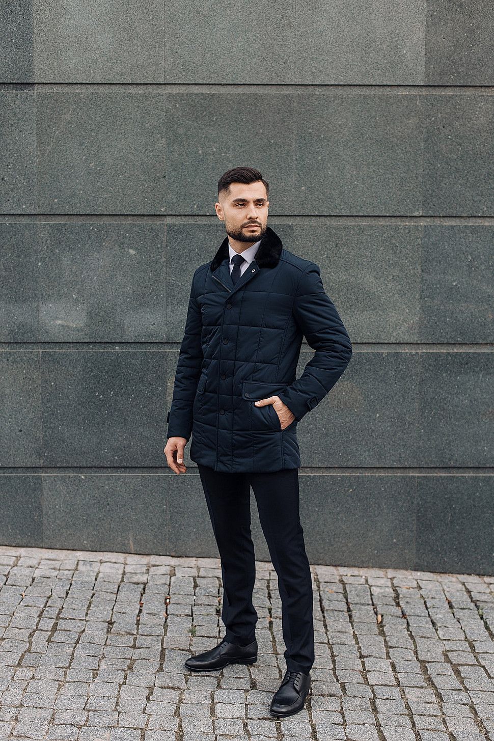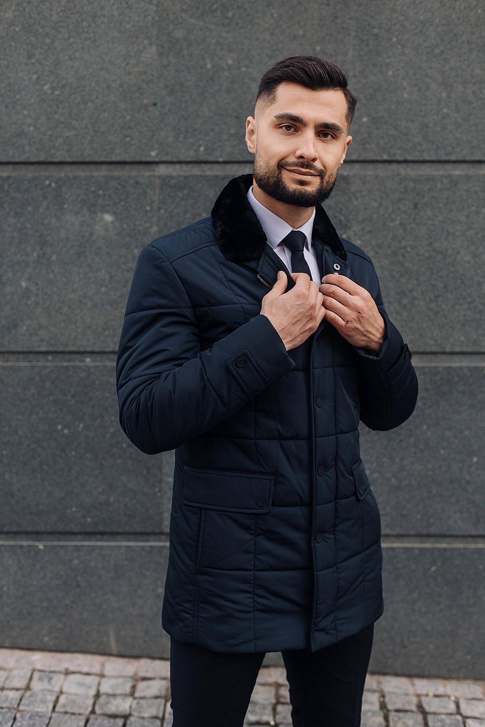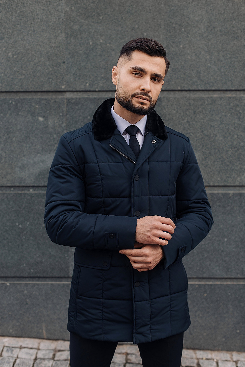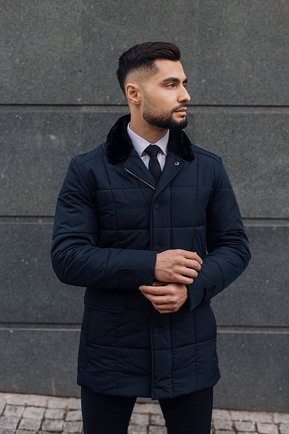 Мужская куртка темно-синего цвета с меховым воротником