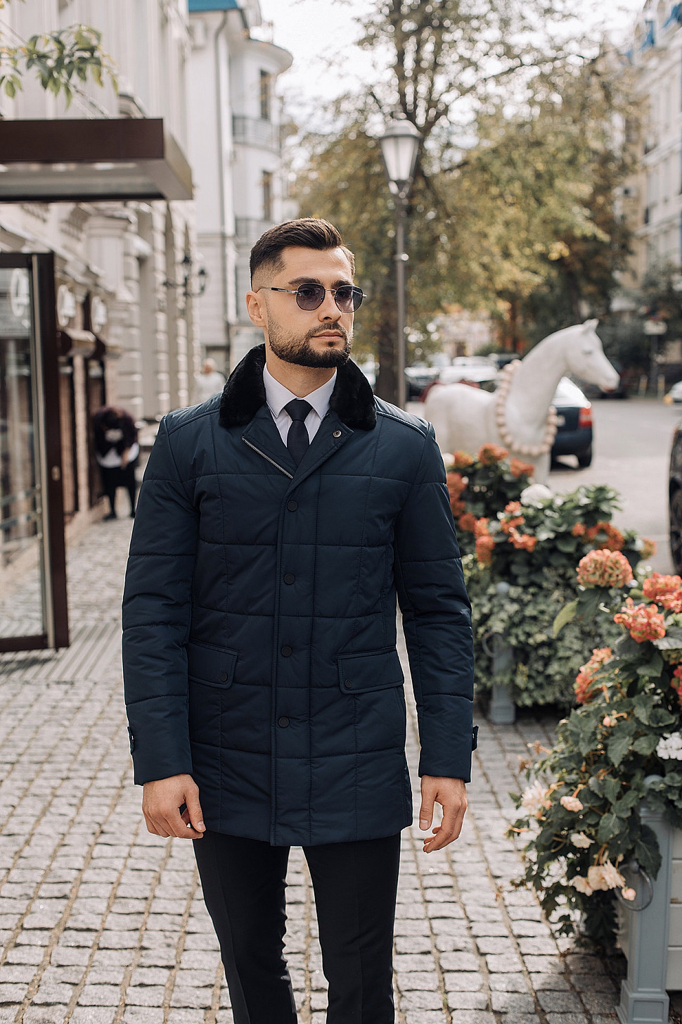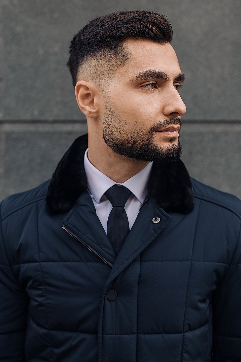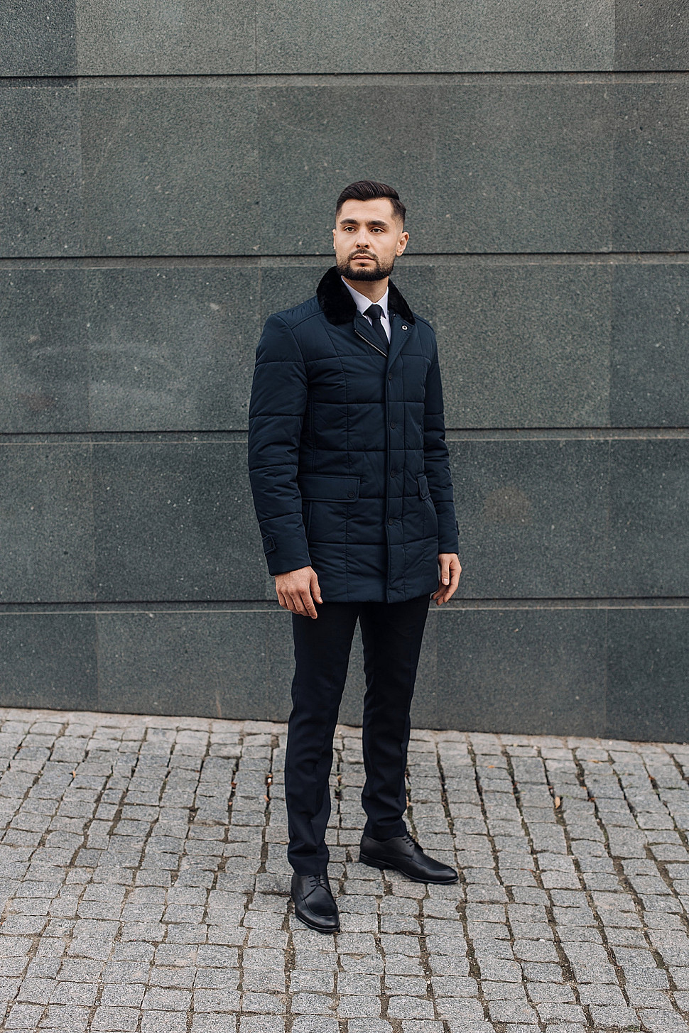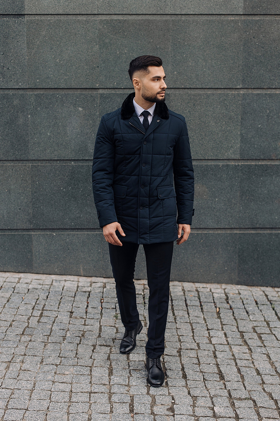 Мужская куртка темно-синего цвета с меховым воротником