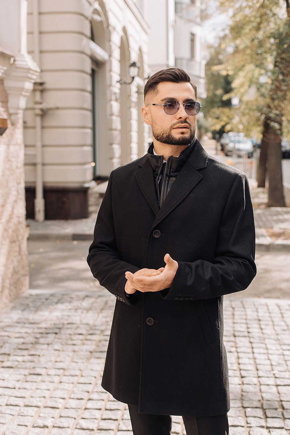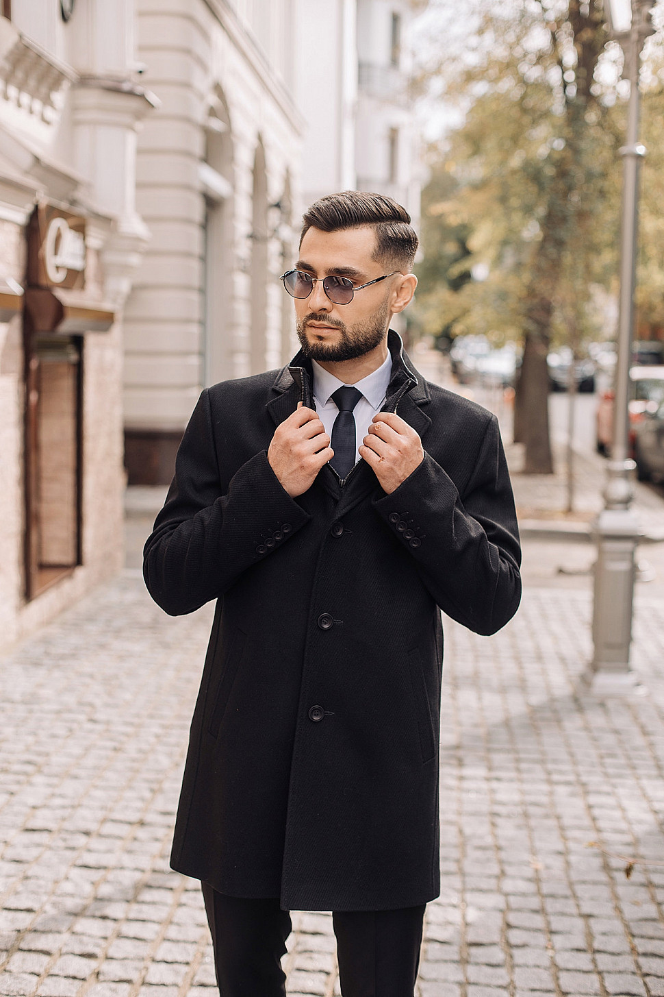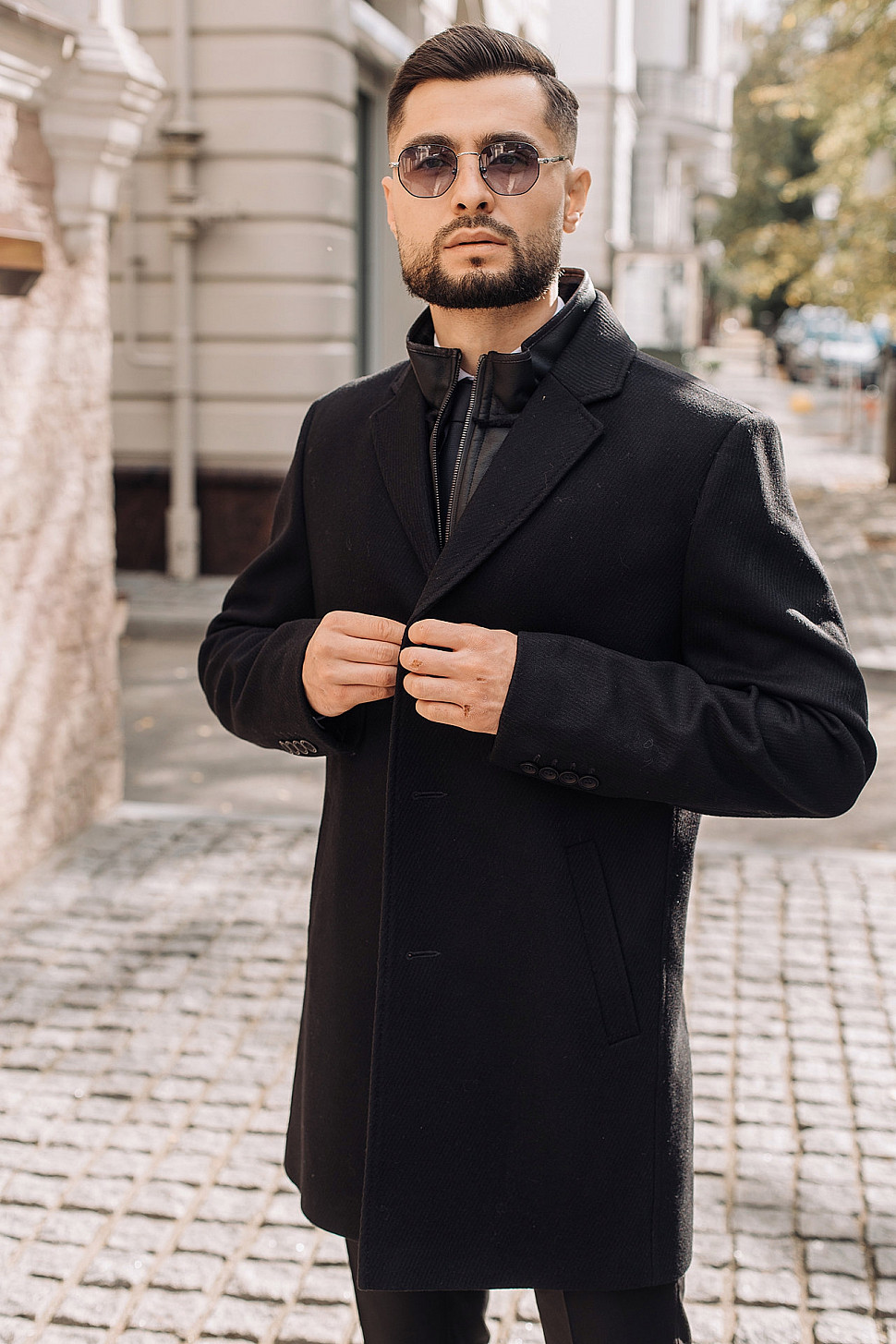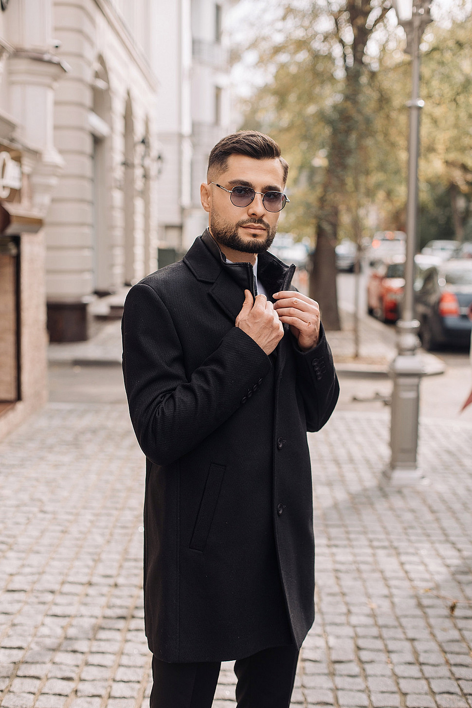Мужское пальто черного цвета с двойным воротником