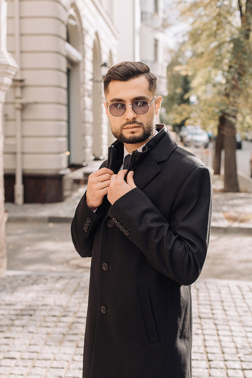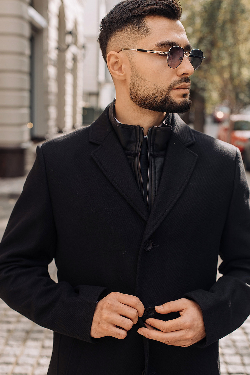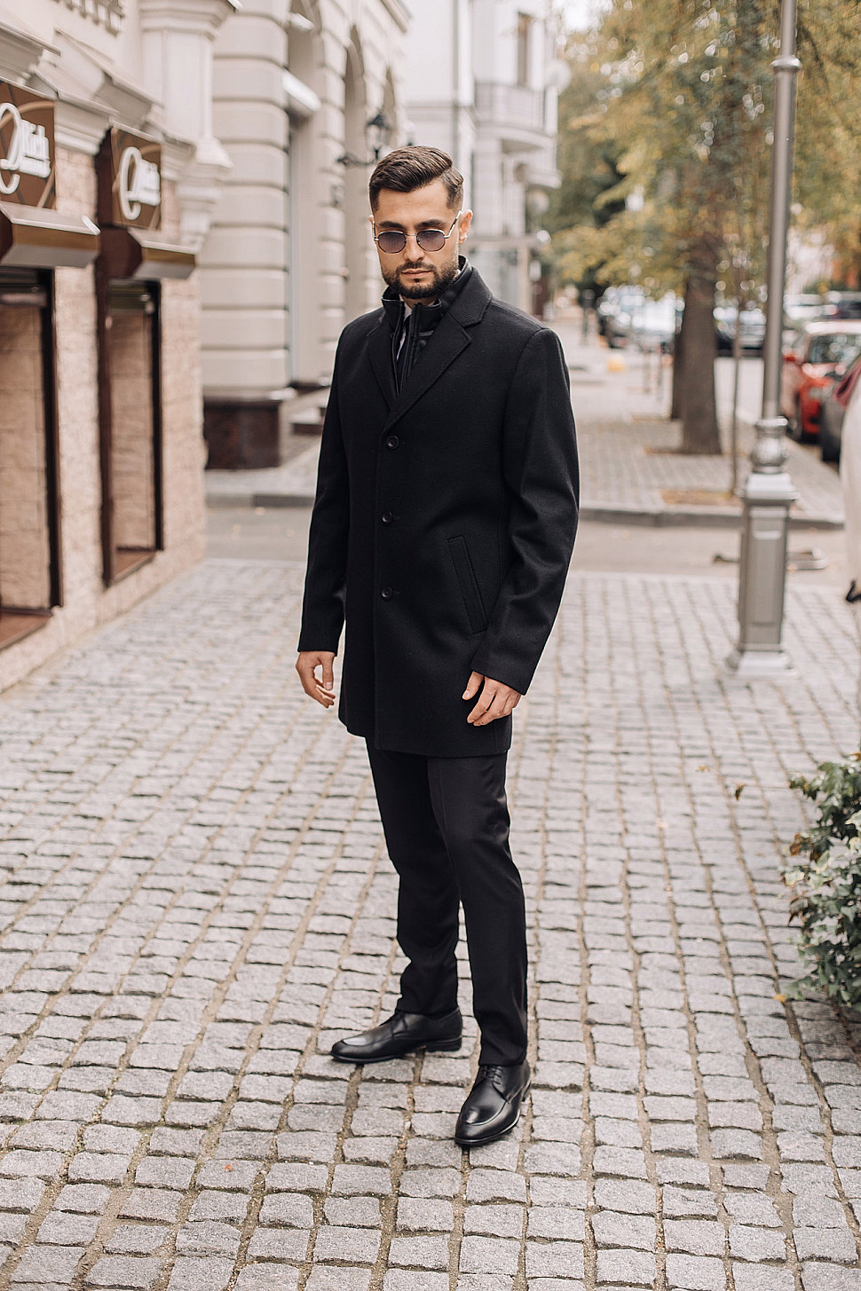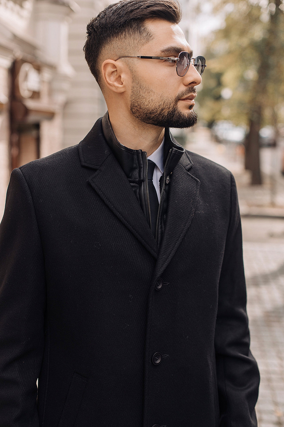 Мужское пальто черного цвета с двойным воротником