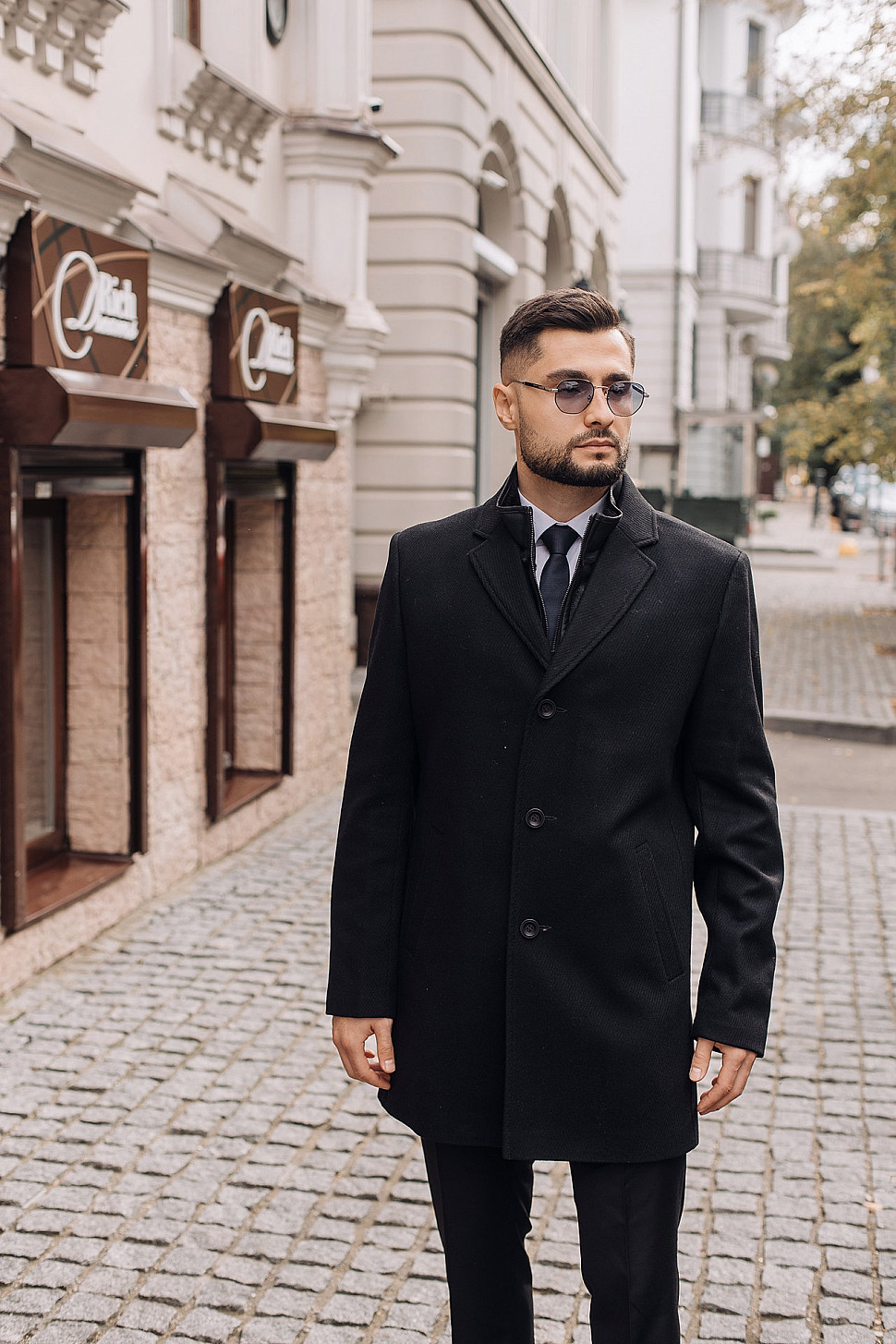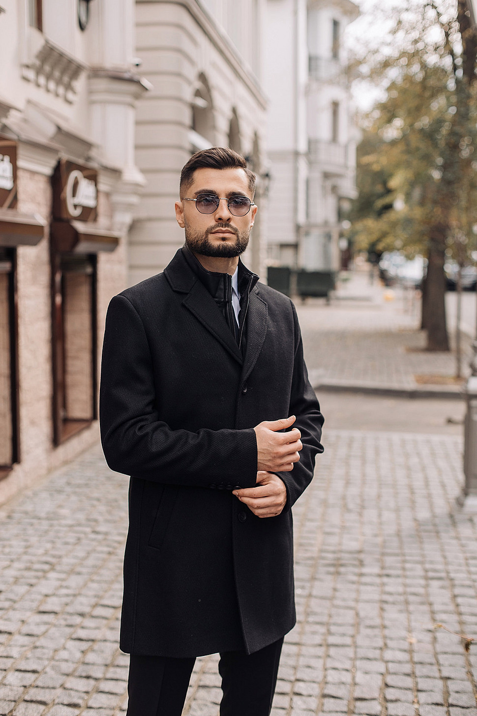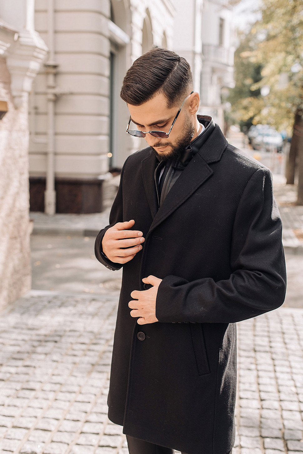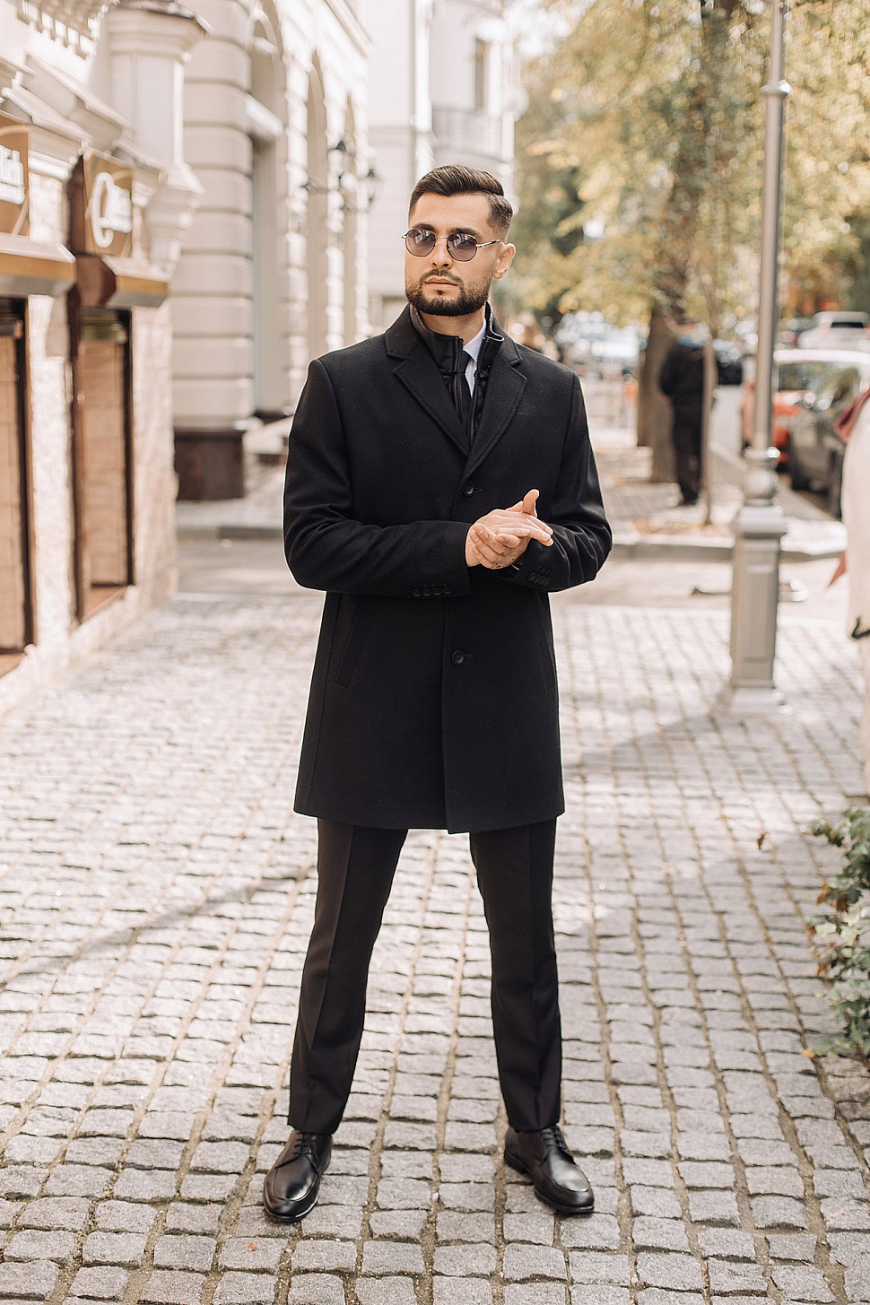 Мужское пальто черного цвета с двойным воротником