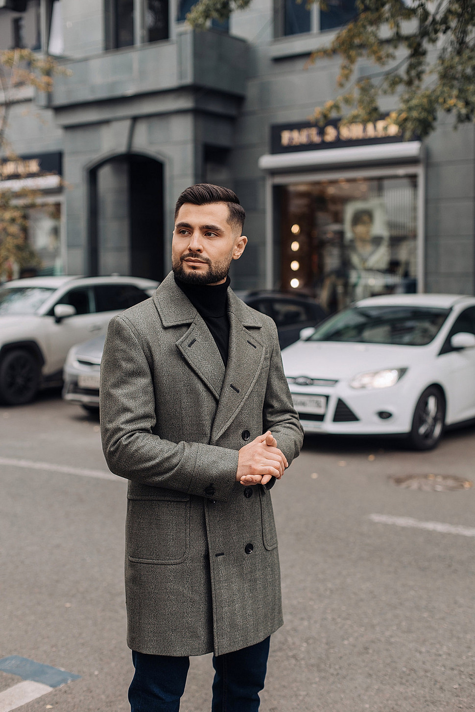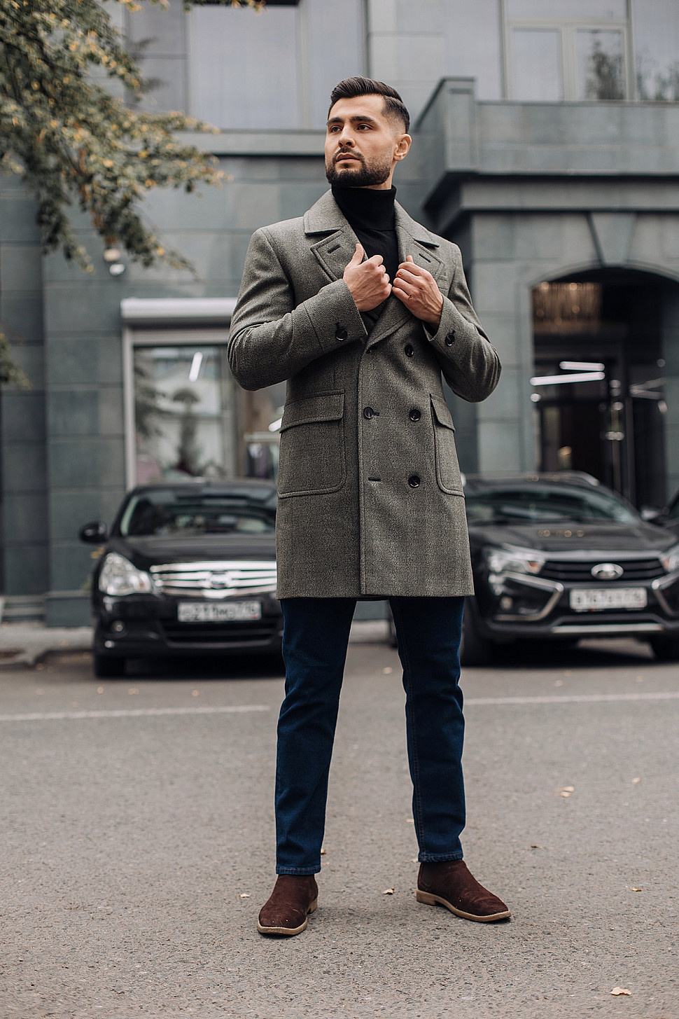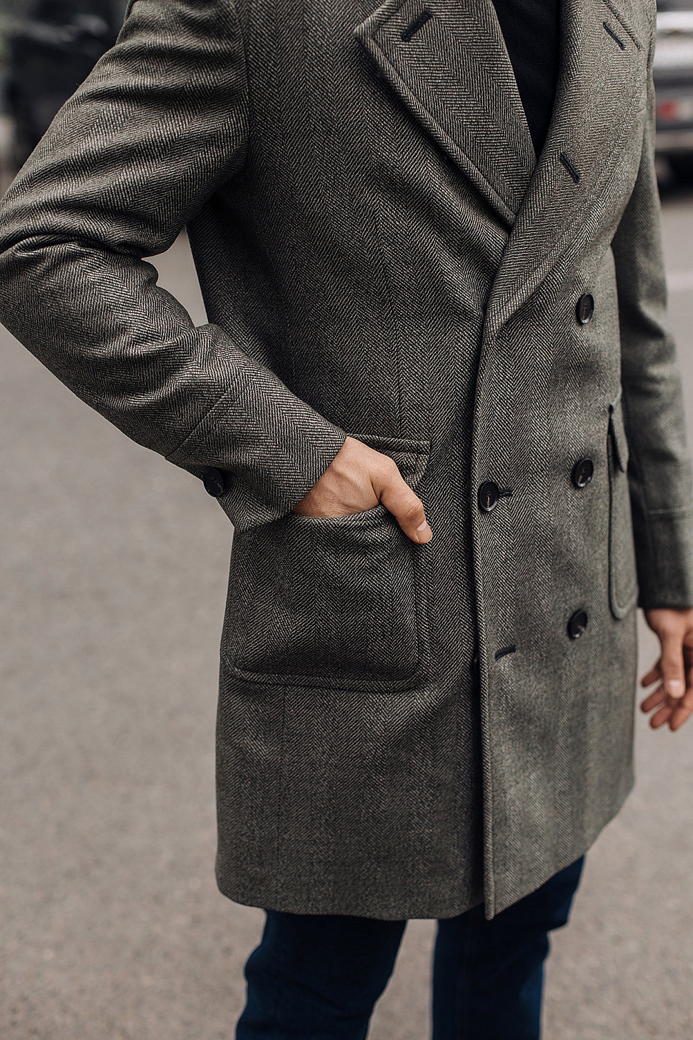 Мужской костюм двойка серого цвета в мелкую клетку с накладными карманами