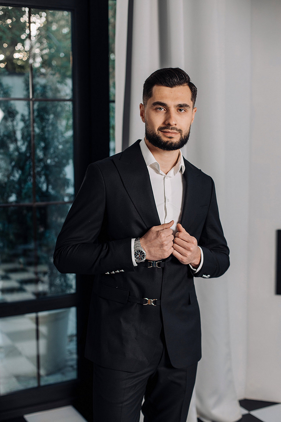 Мужской костюм тройка черного цвета и сноуборд