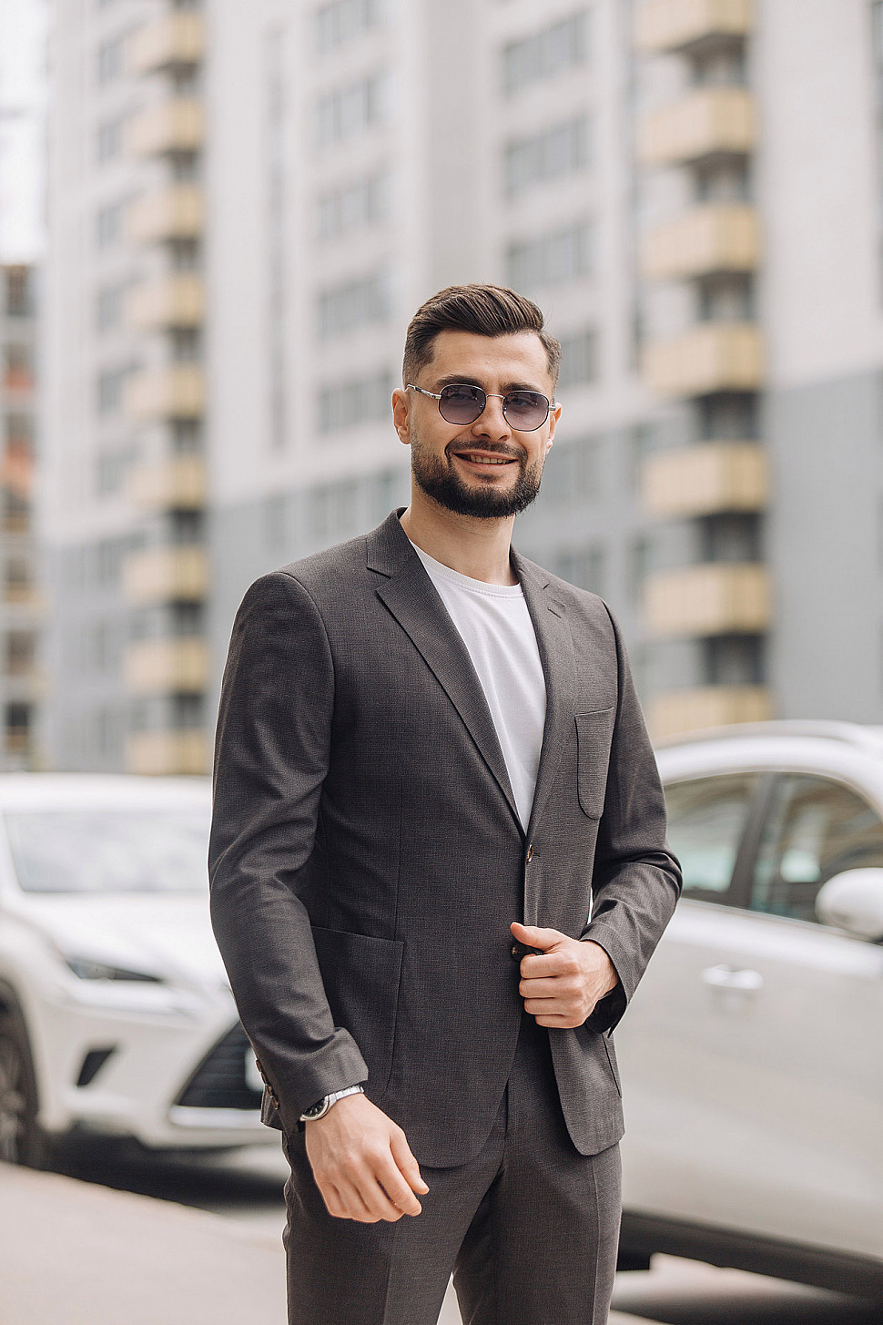 Мужской костюм двойка графитового цвета с накладными карманами