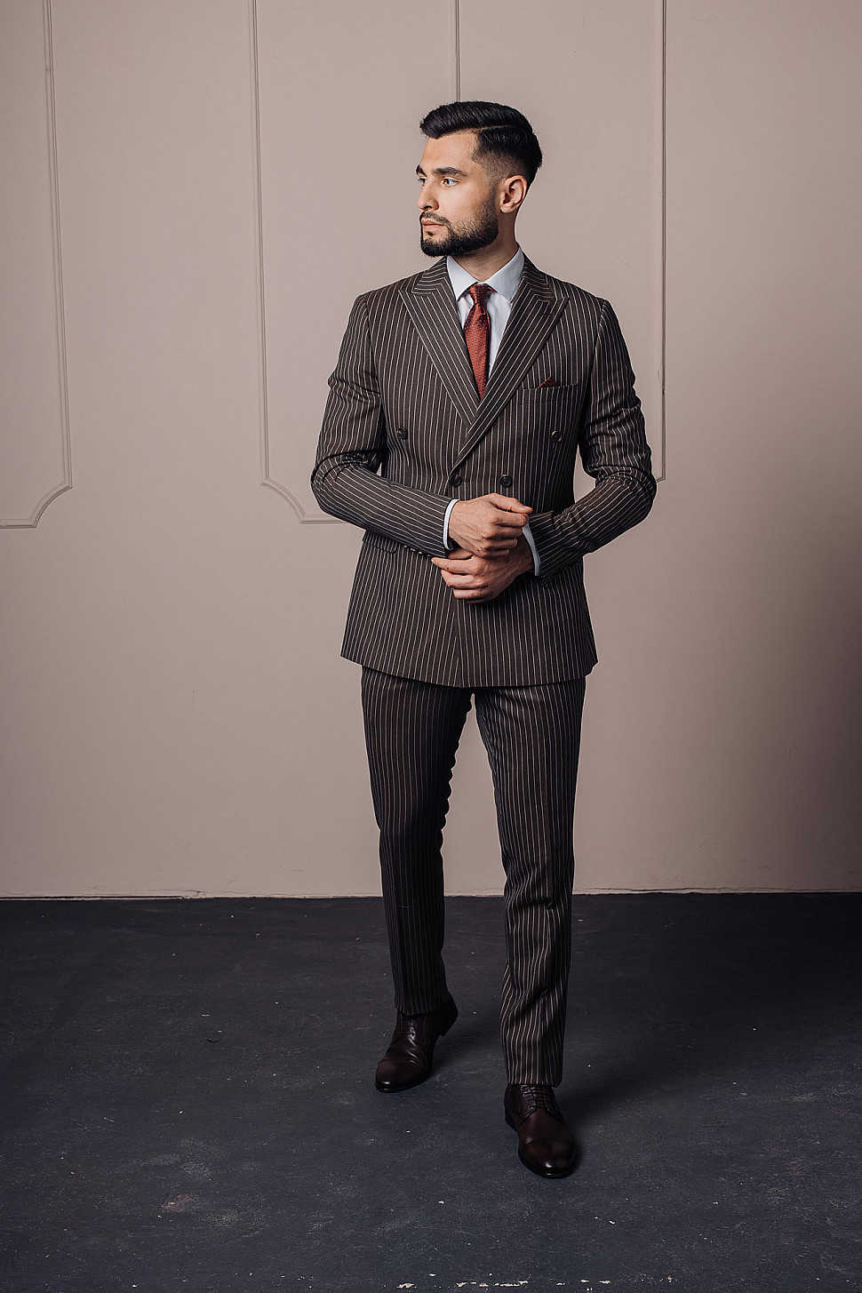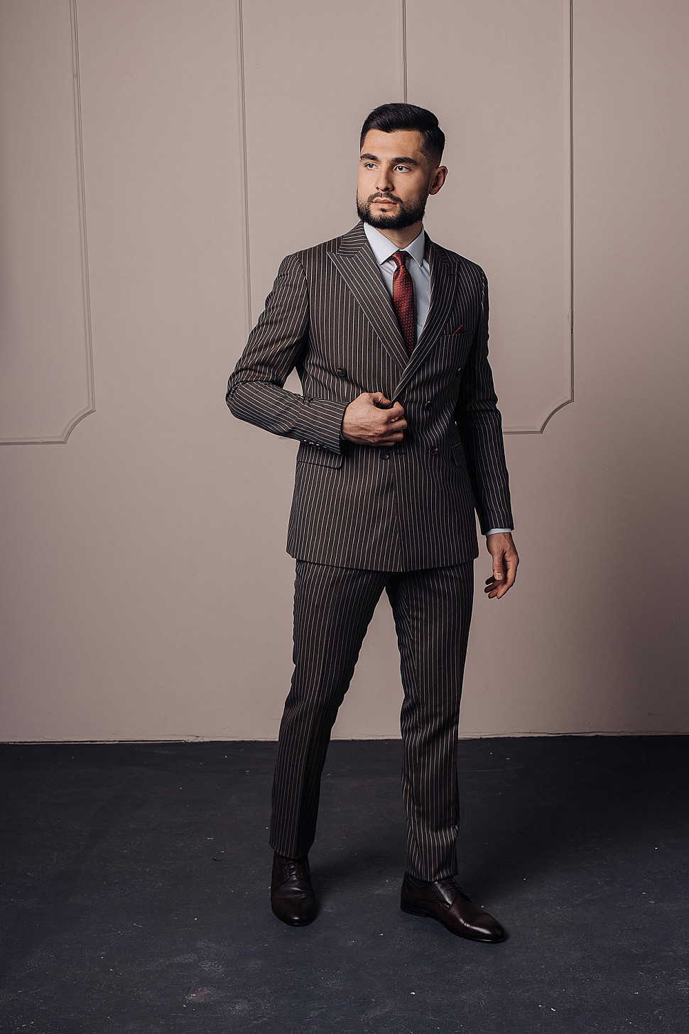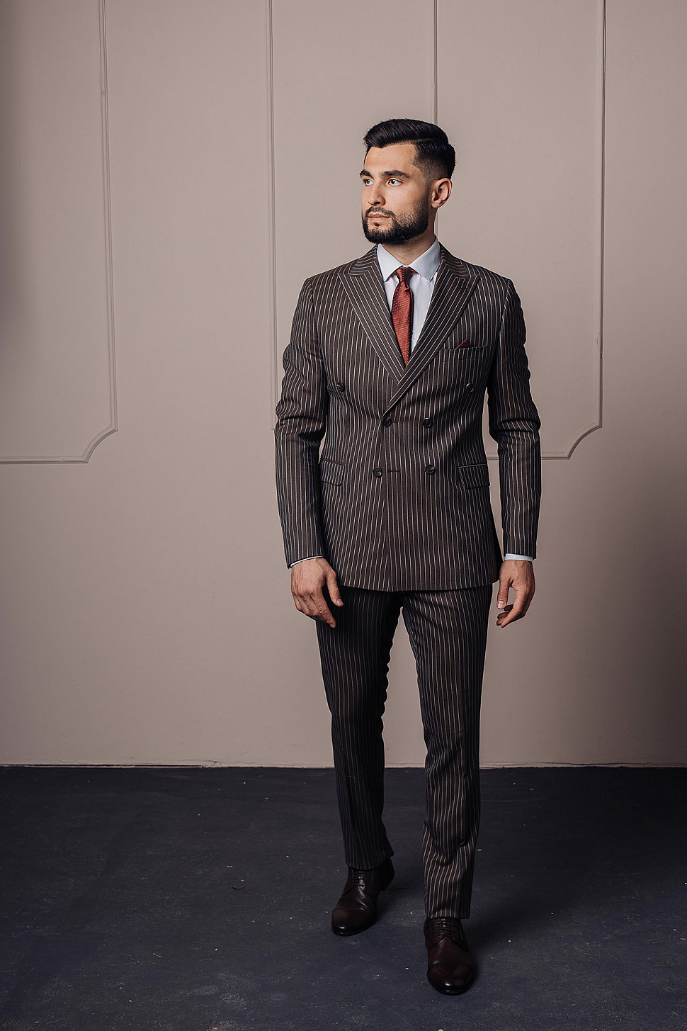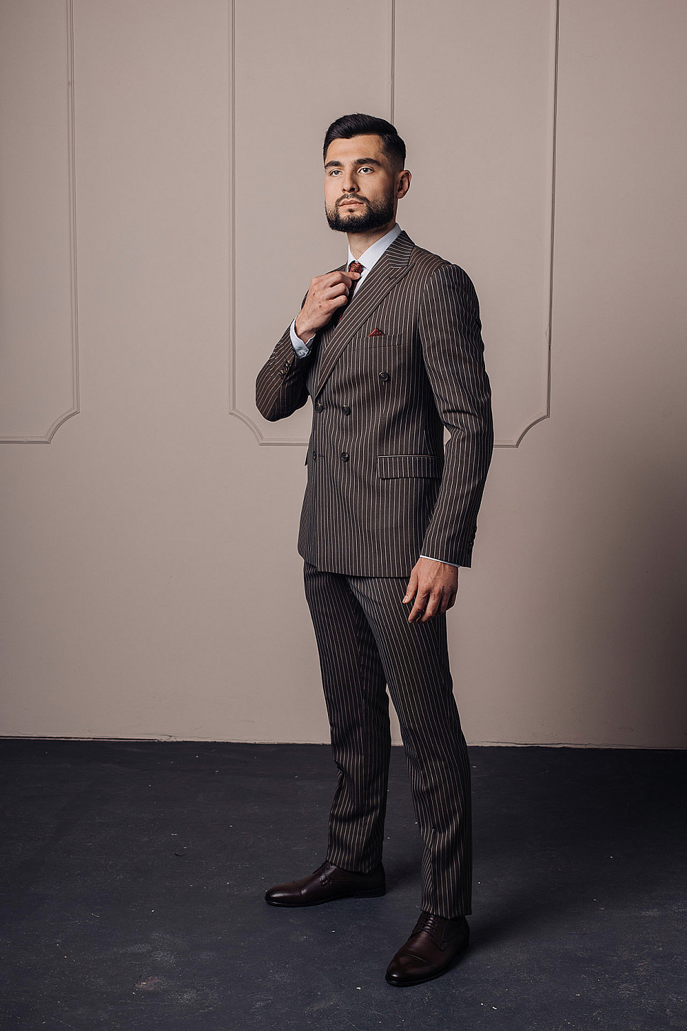 Мужской костюм двойка коричневого цвета в полоску двубортный