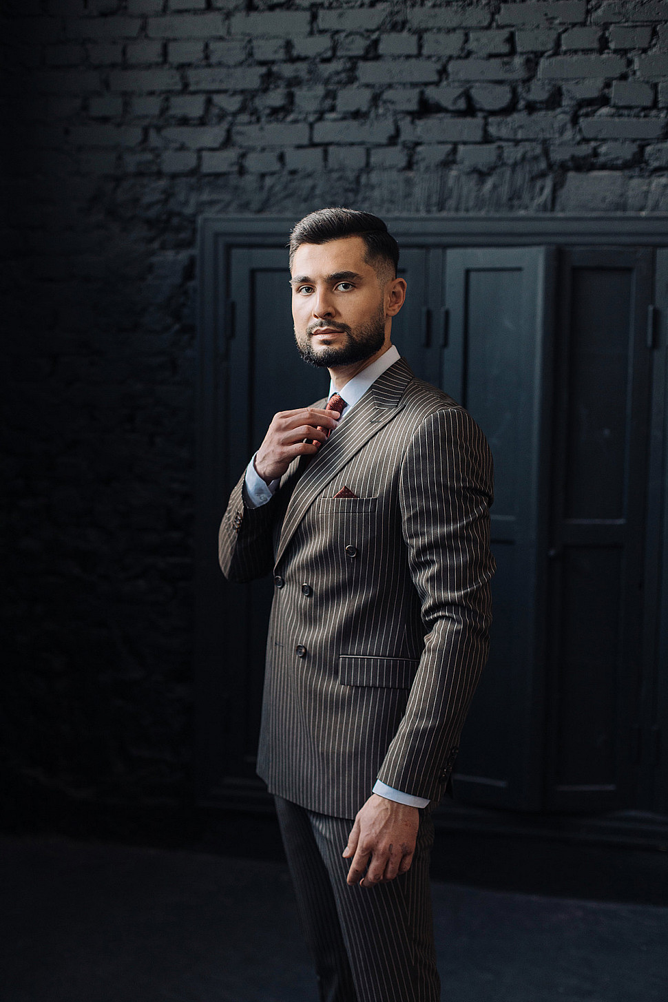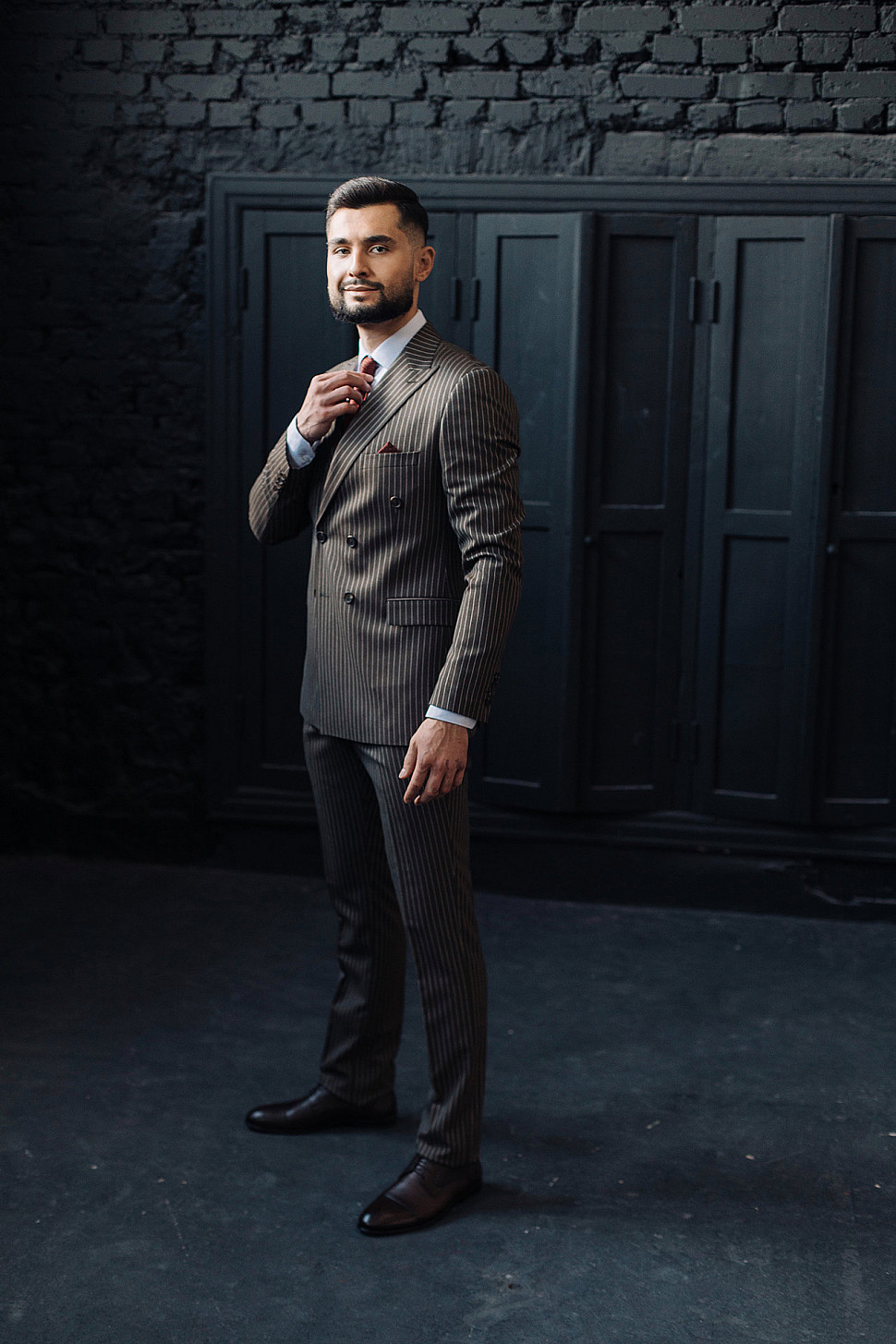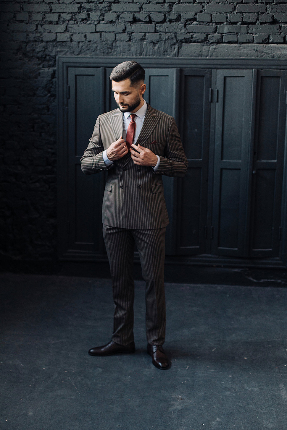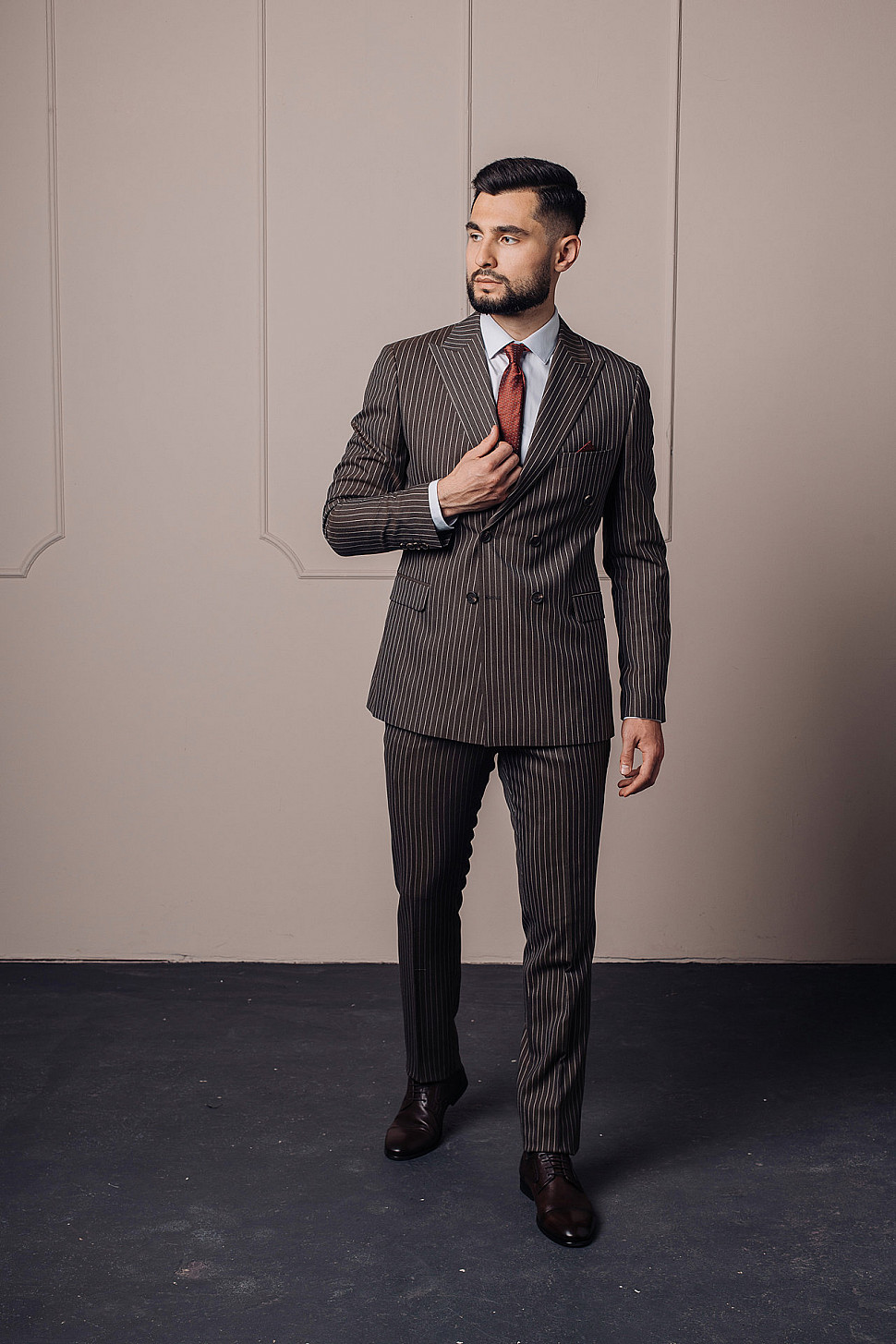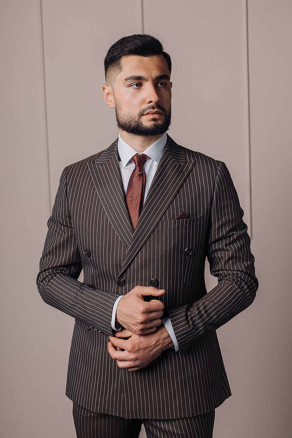 Мужской костюм двойка коричневого цвета в полоску двубортный