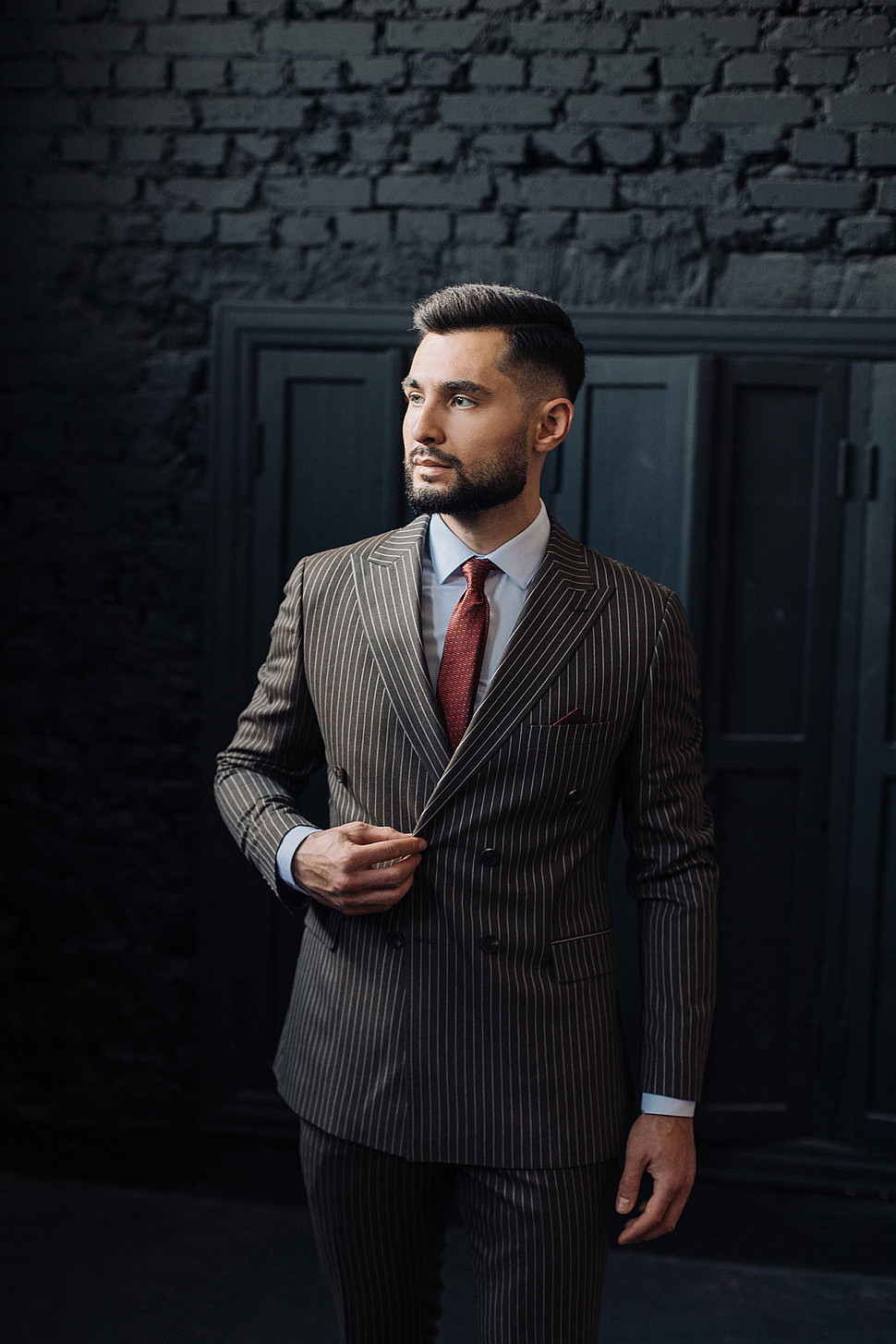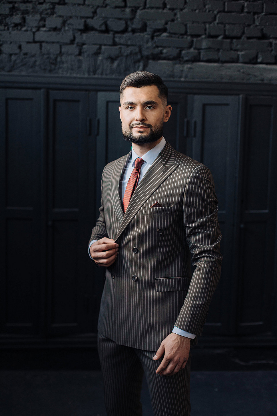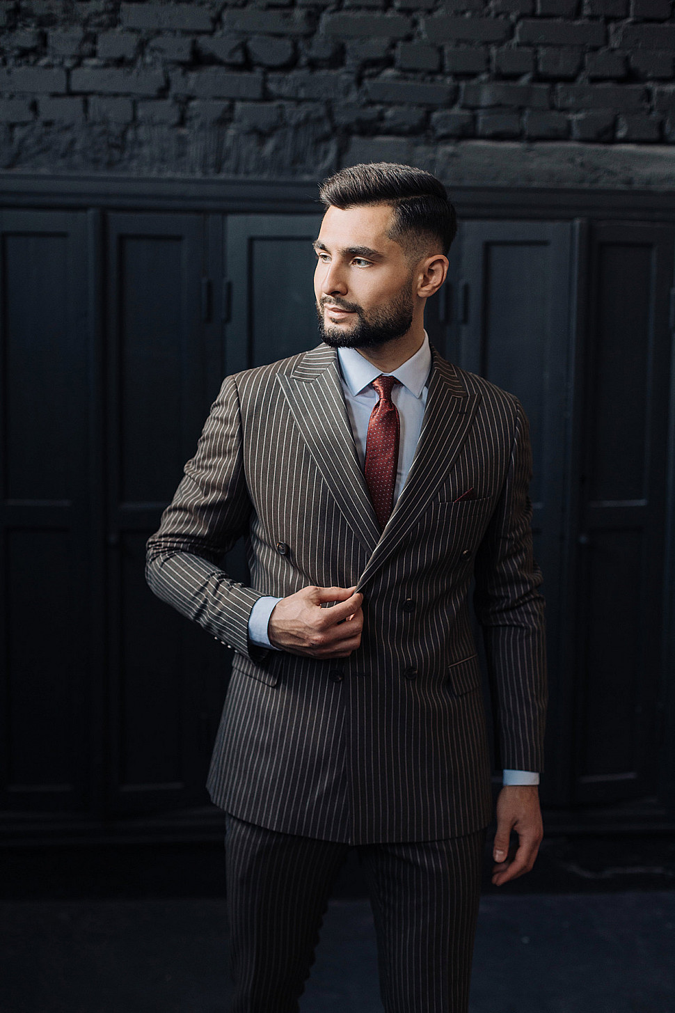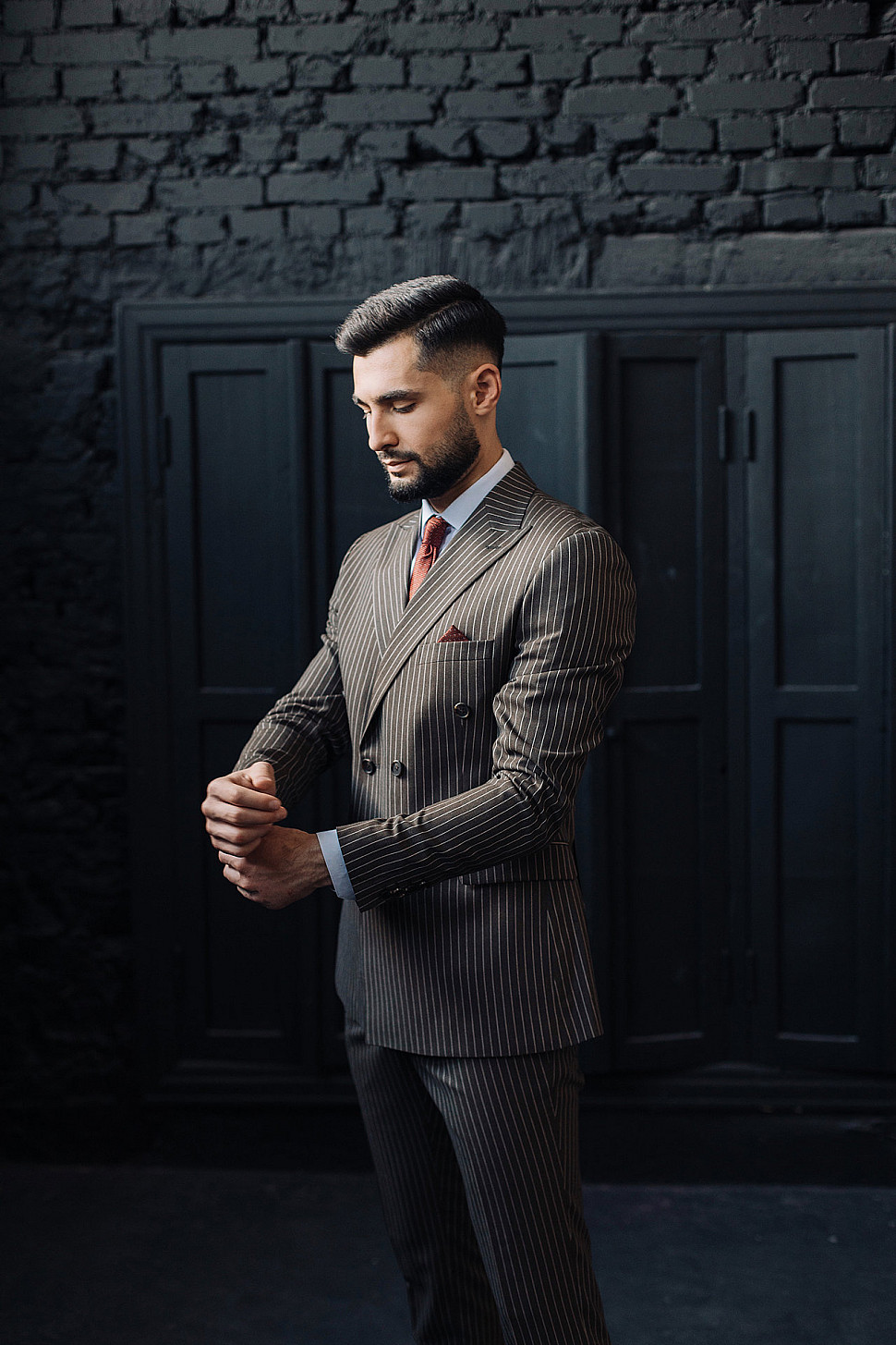 Мужской костюм двойка коричневого цвета в полоску двубортный