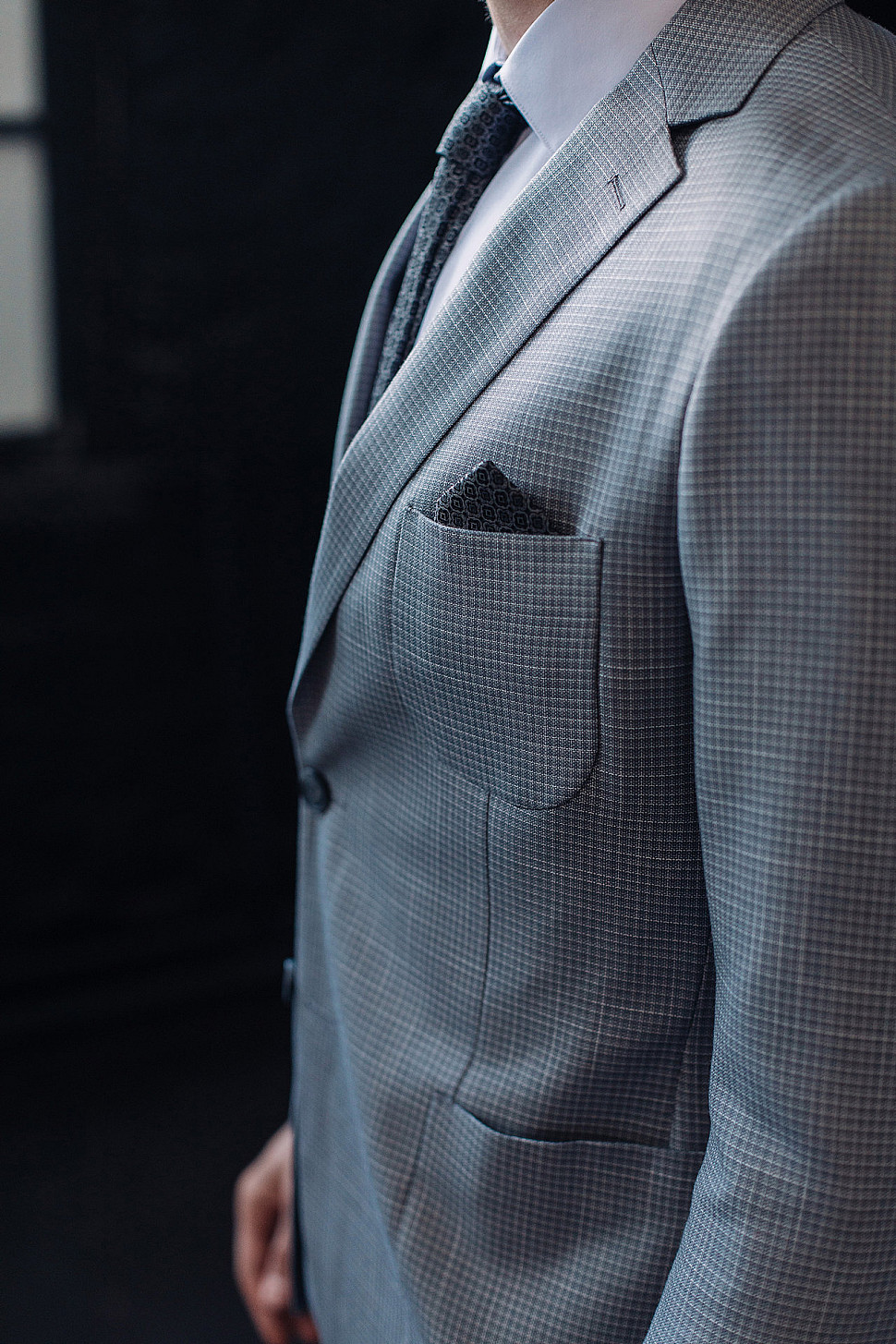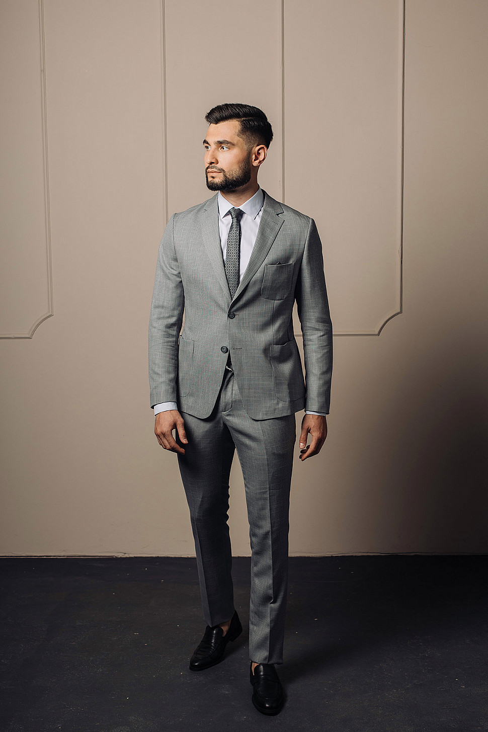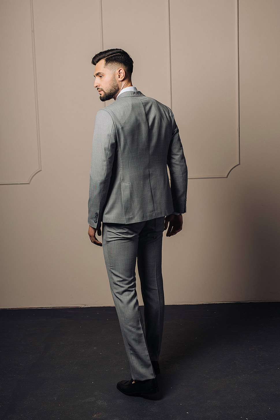 Мужской костюм двойка серого цвета в мелкую клетку с накладными карманами