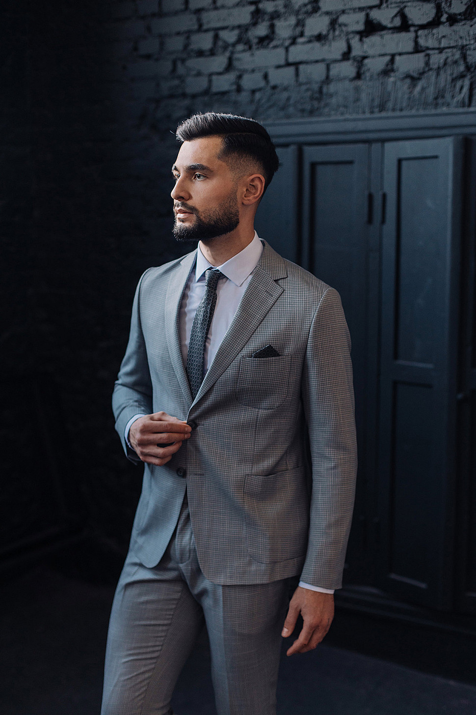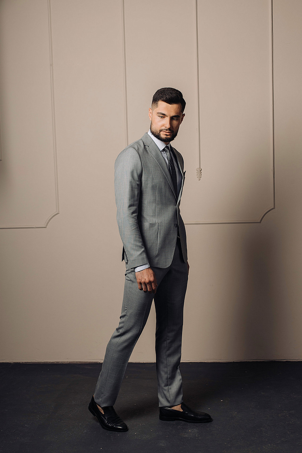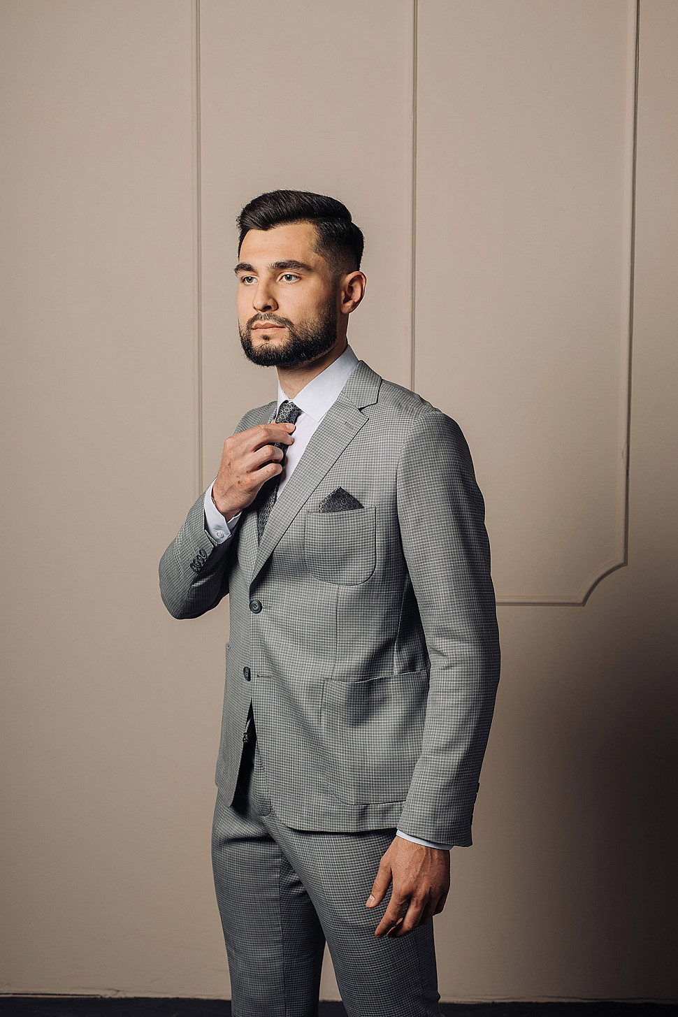 Мужской костюм двойка серого цвета в мелкую клетку с накладными карманами