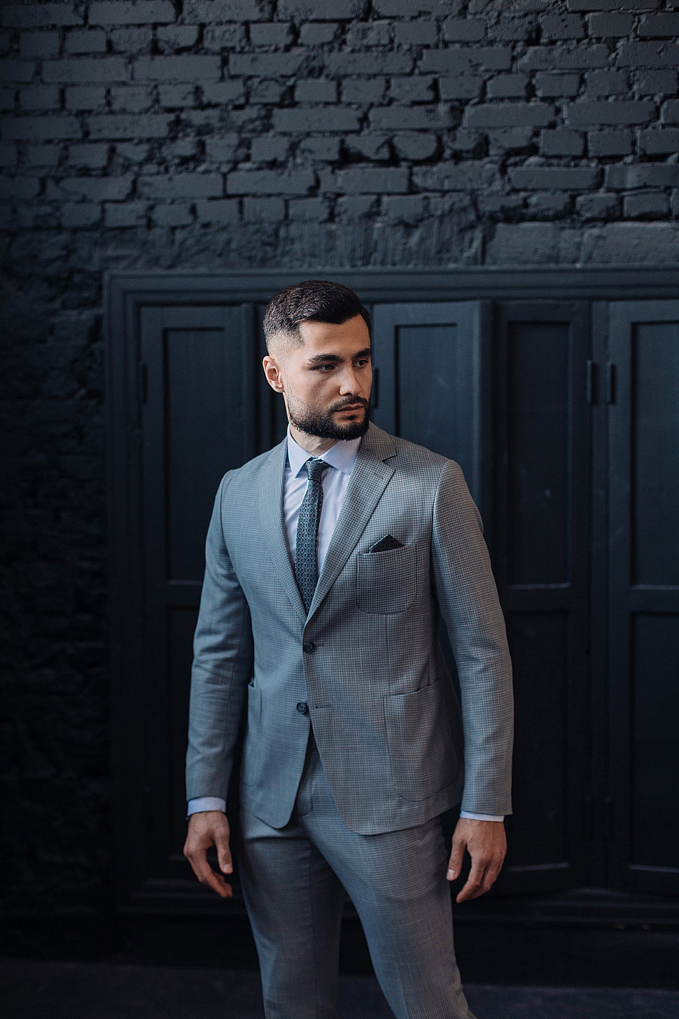 Мужской костюм двойка графитового цвета с накладными карманами