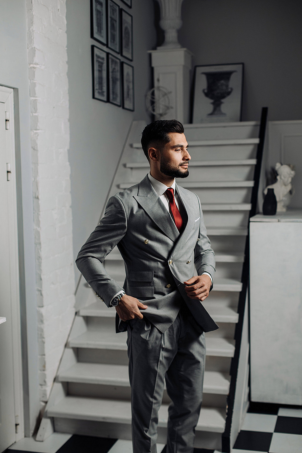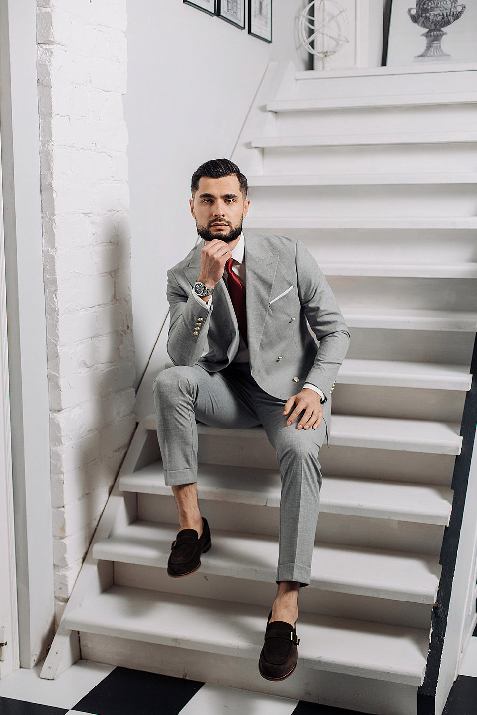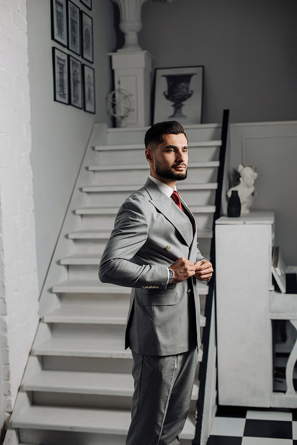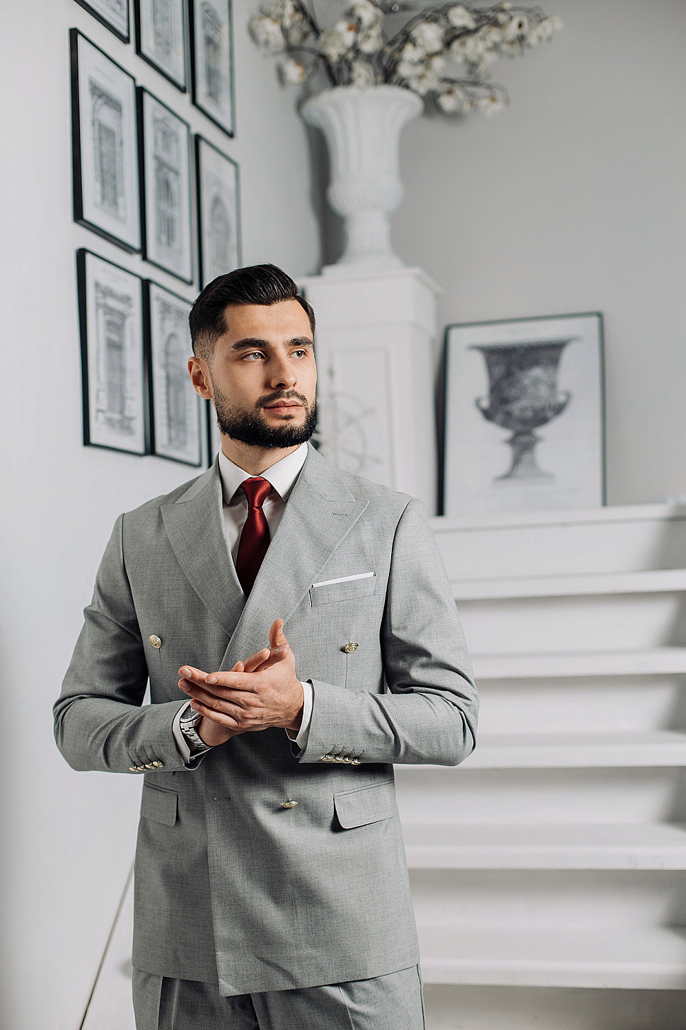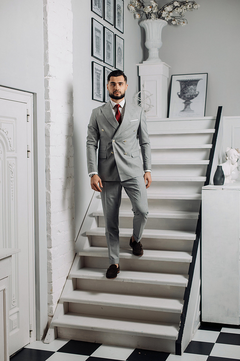 Мужской костюм двойка серый двубортный с золотыми пуговицами
