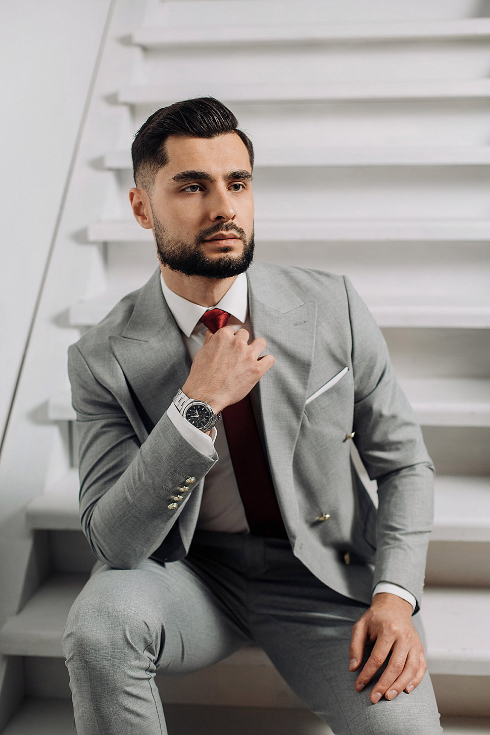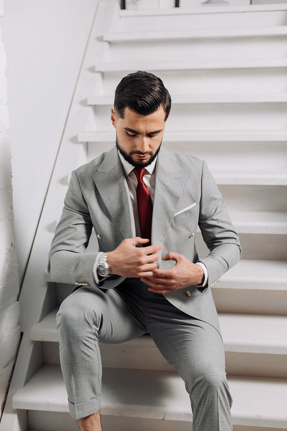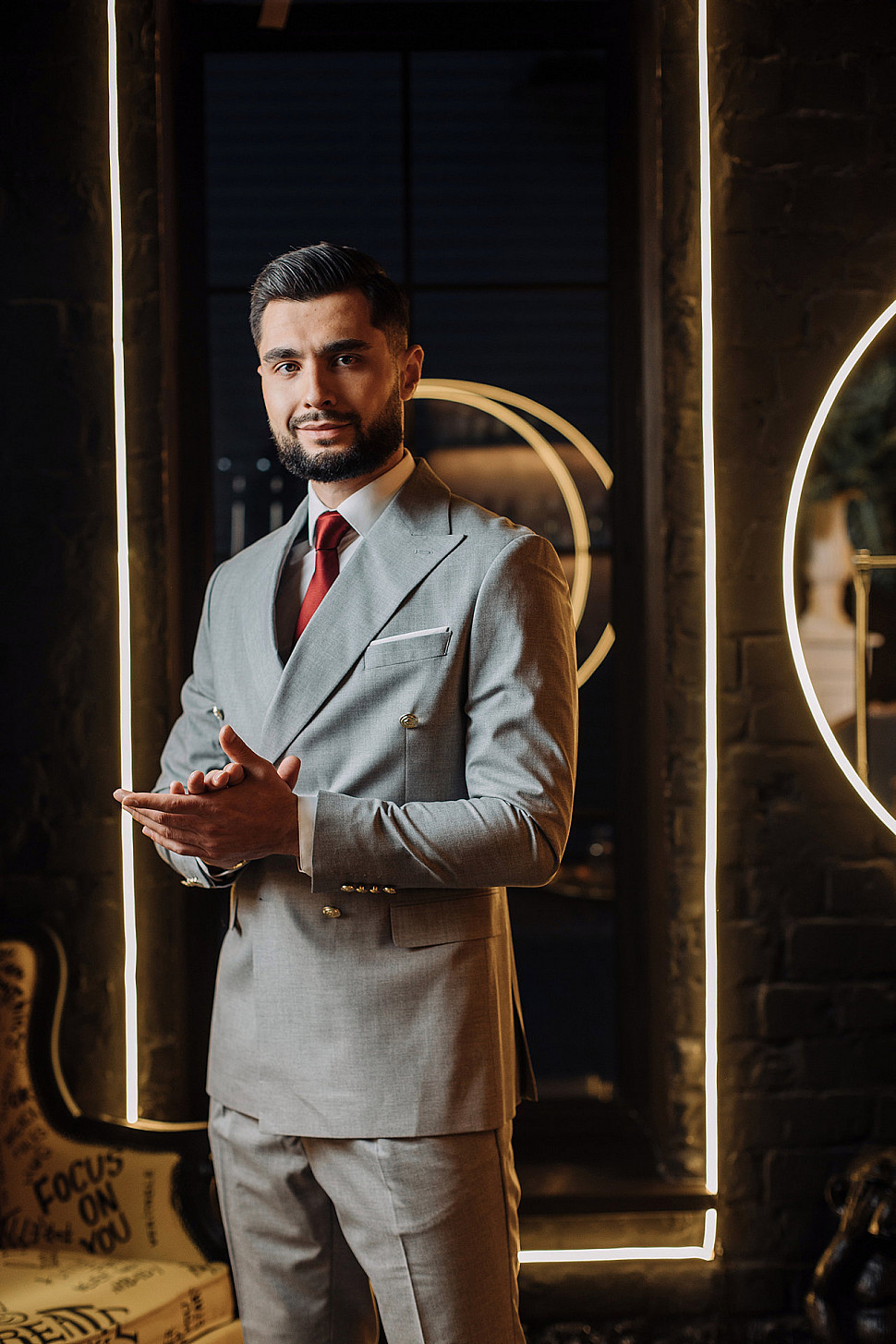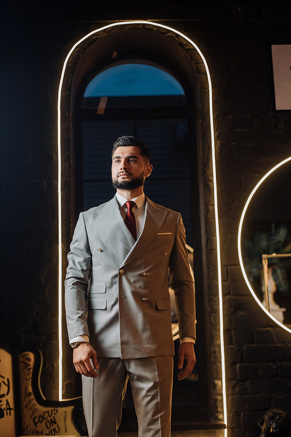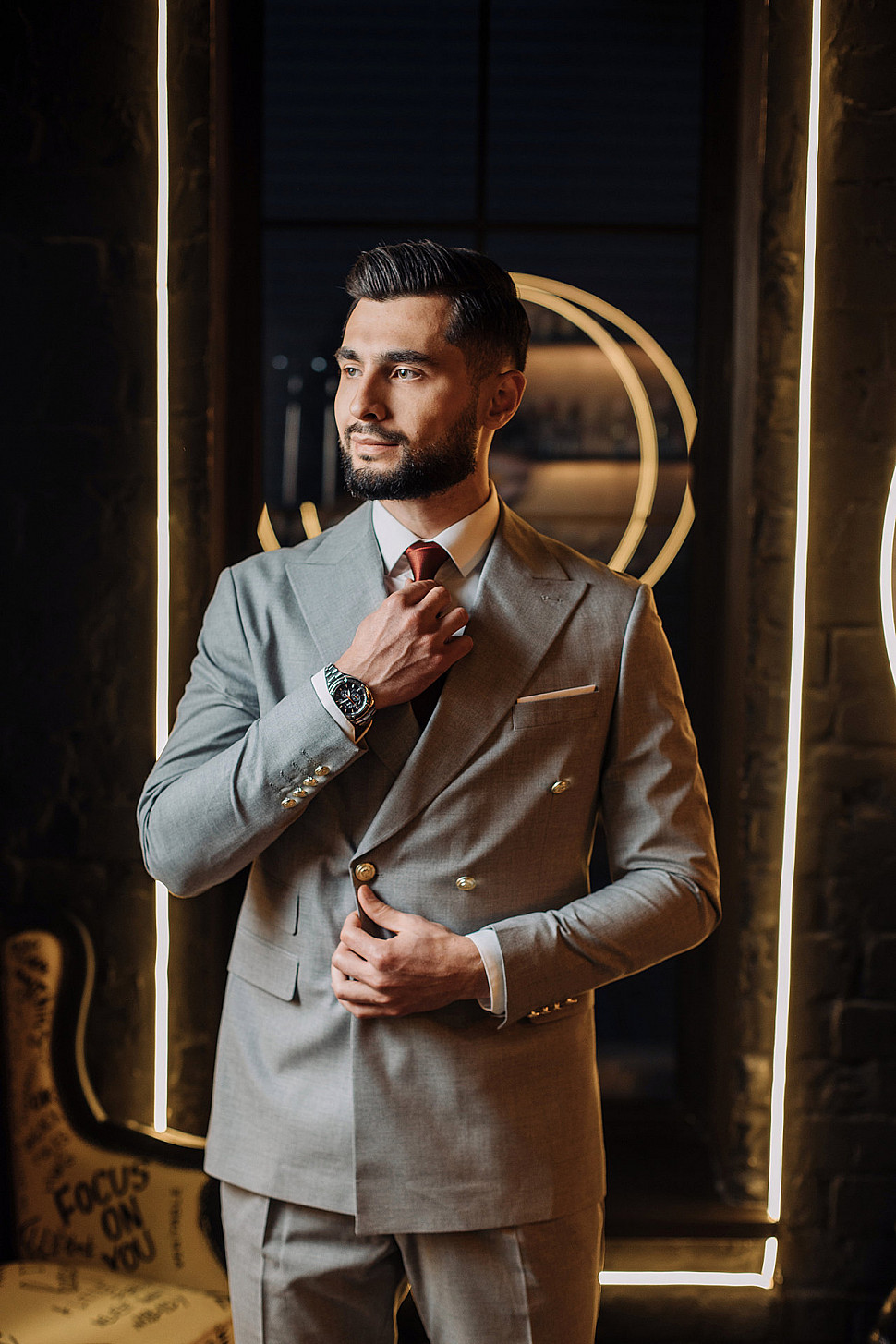 Мужской костюм двойка серый двубортный с золотыми пуговицами