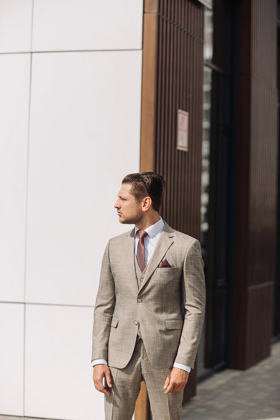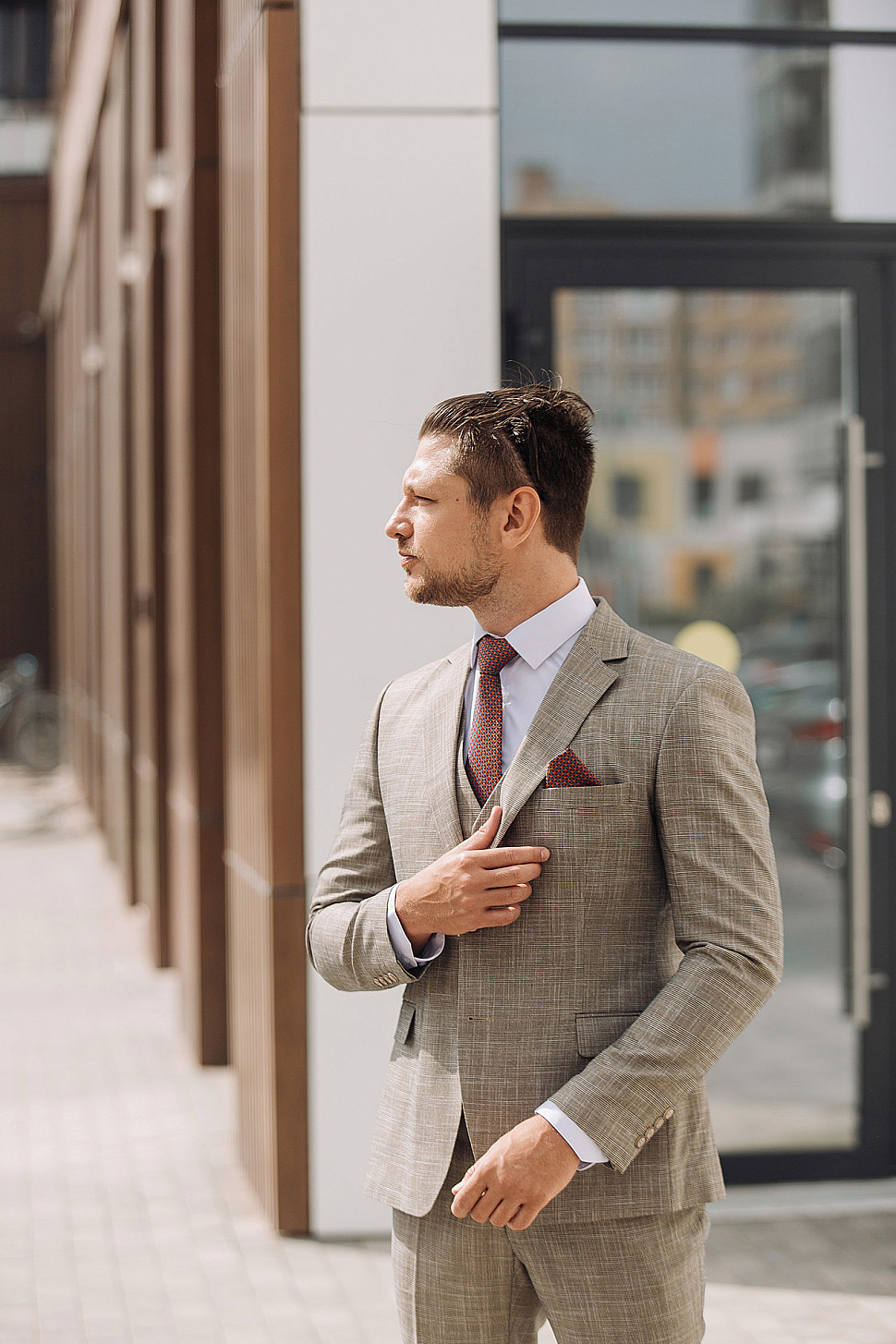 Костюм бежевый тройка с коричневым галстуком