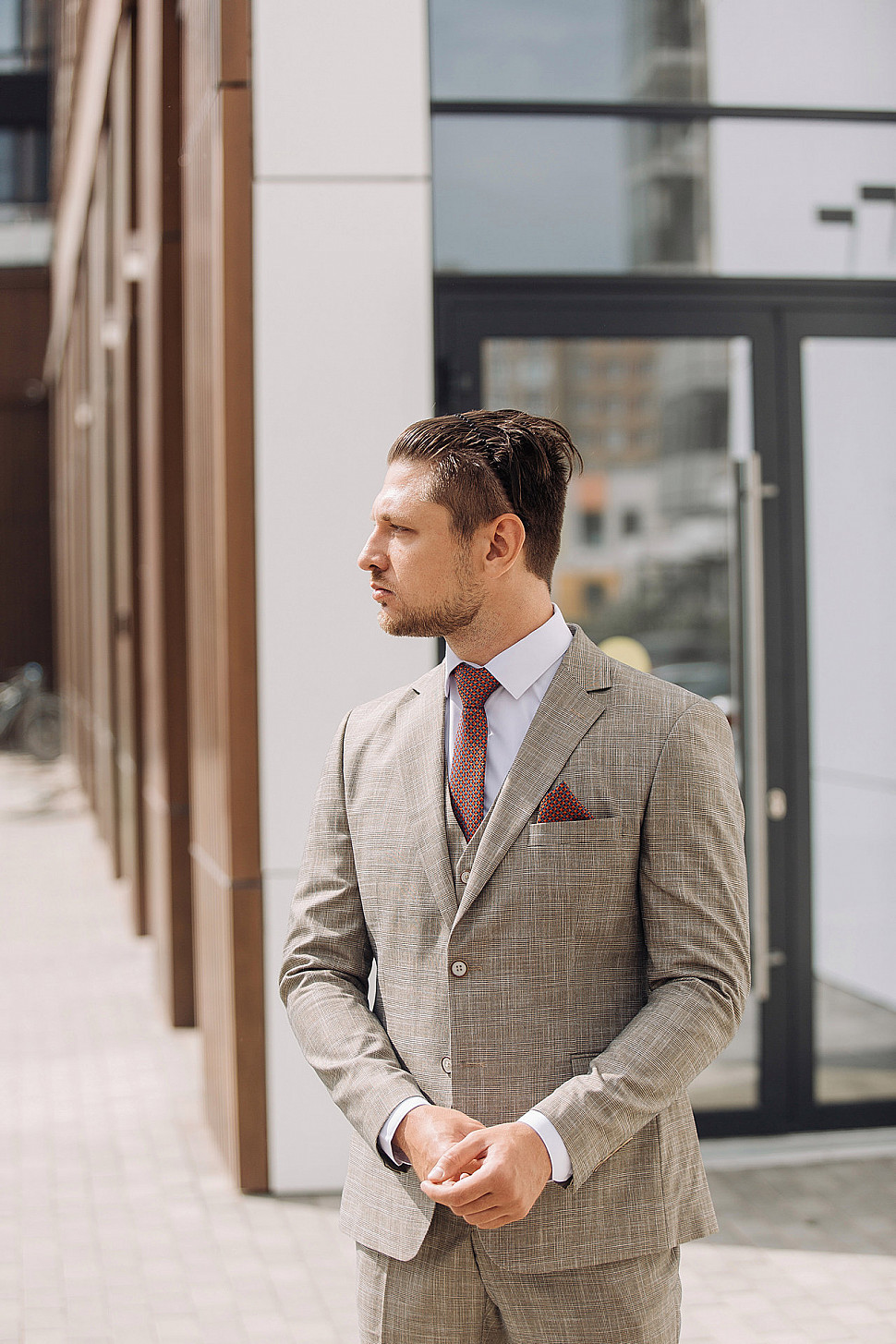 Костюм светло-коричневый двойка в клетку, повседневный и классический образ