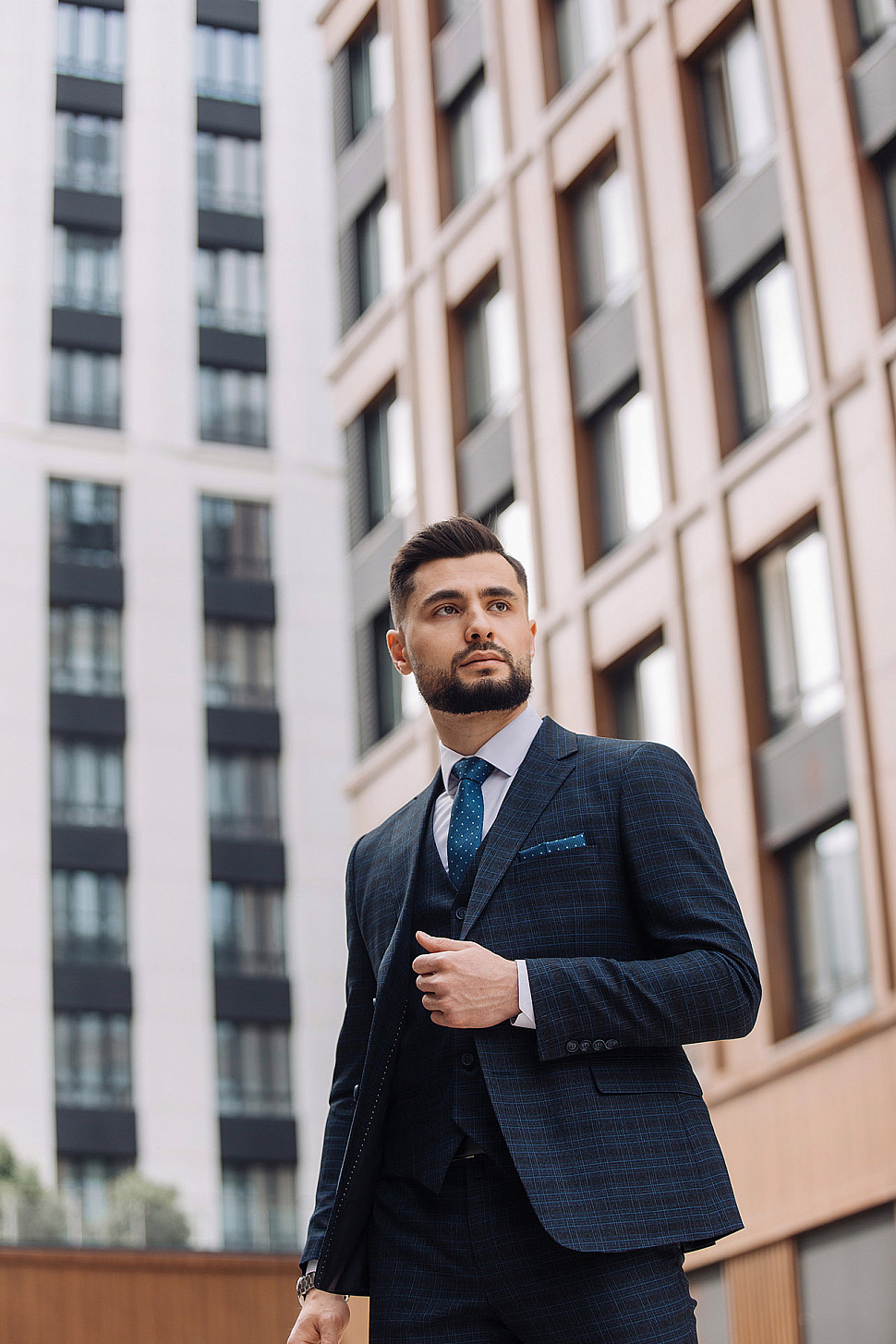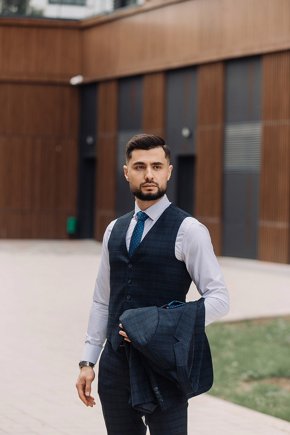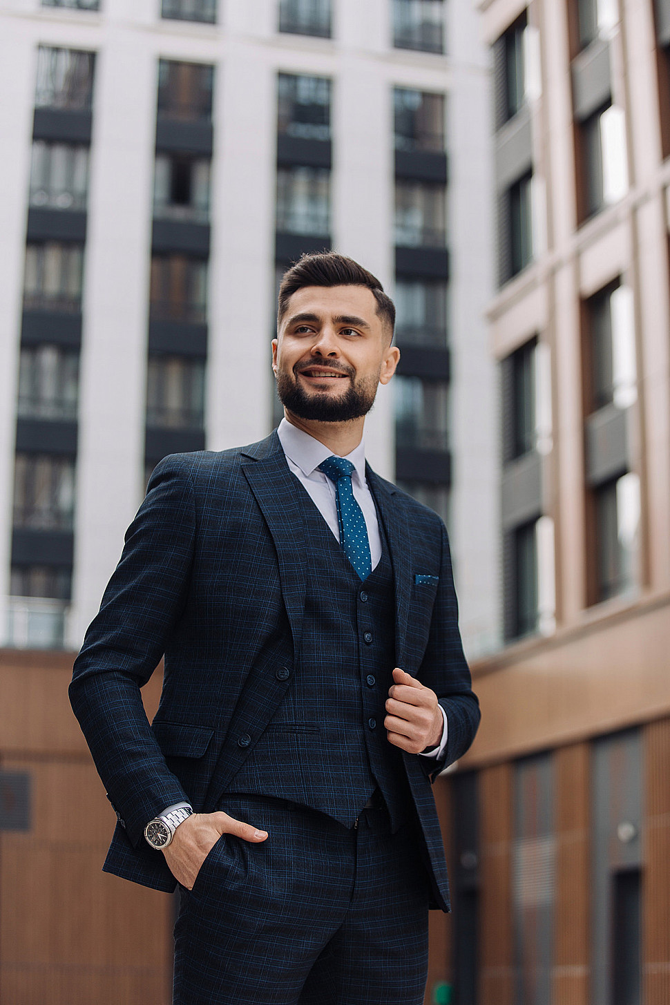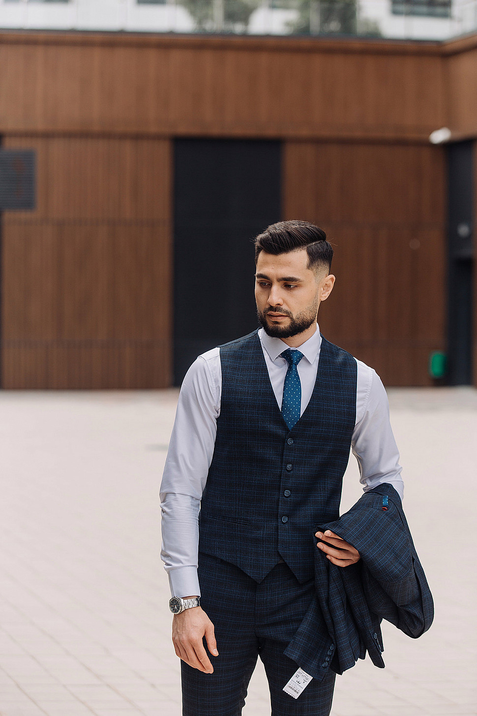 Мужской костюм тройка темно-синего цвета текстурный в клетку