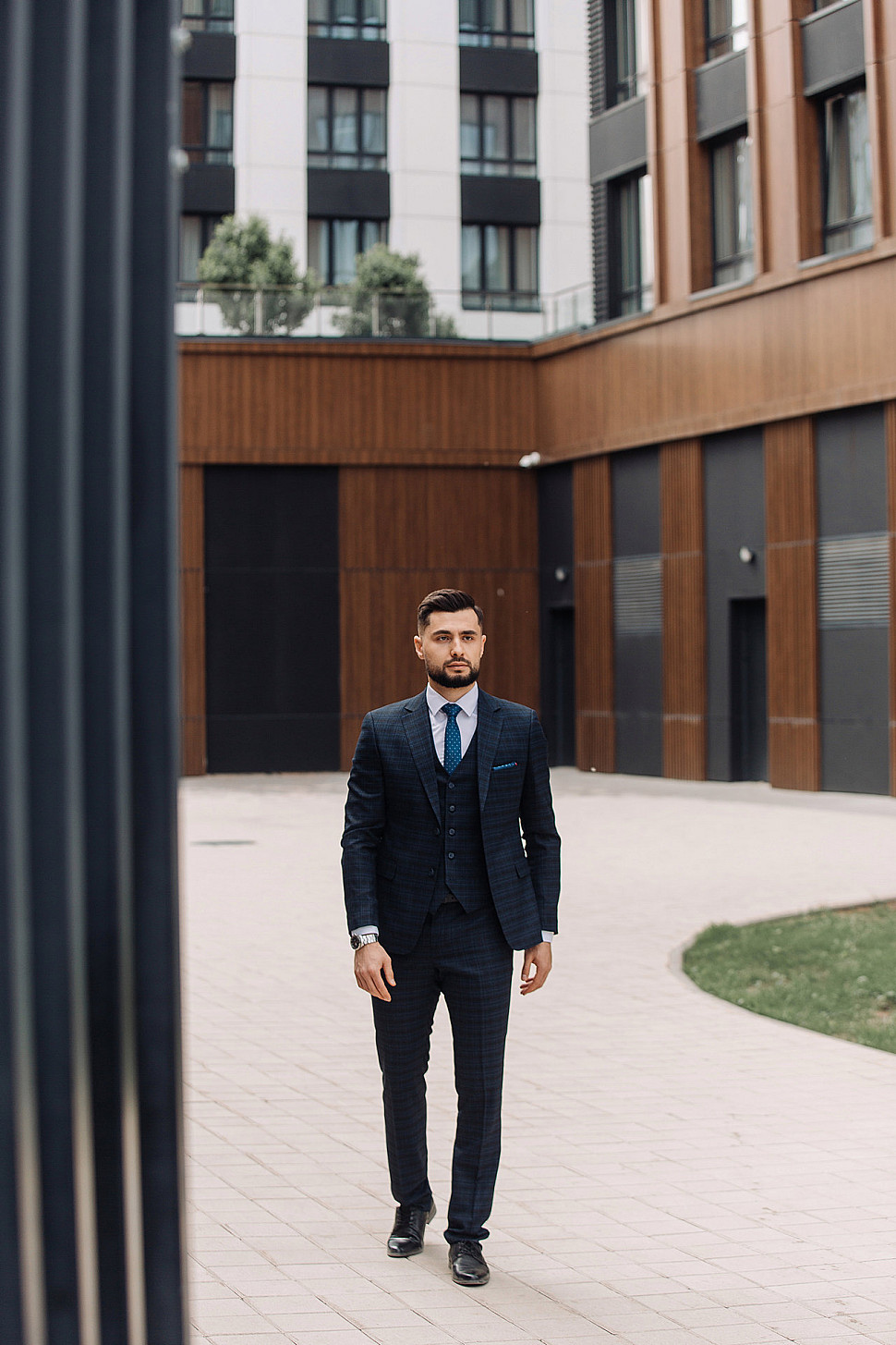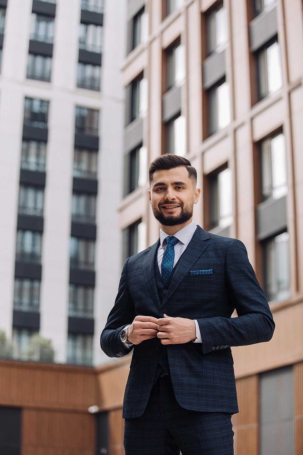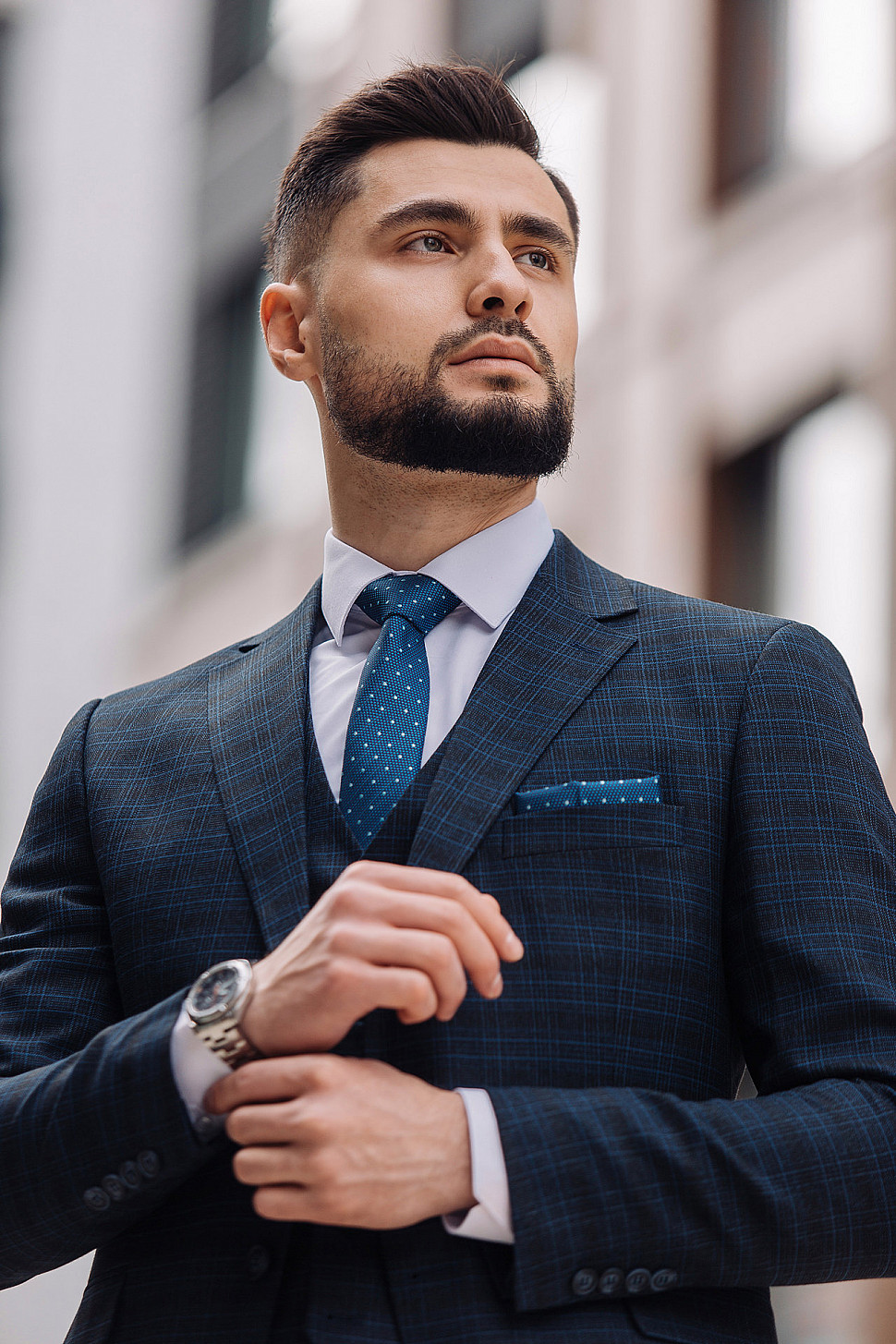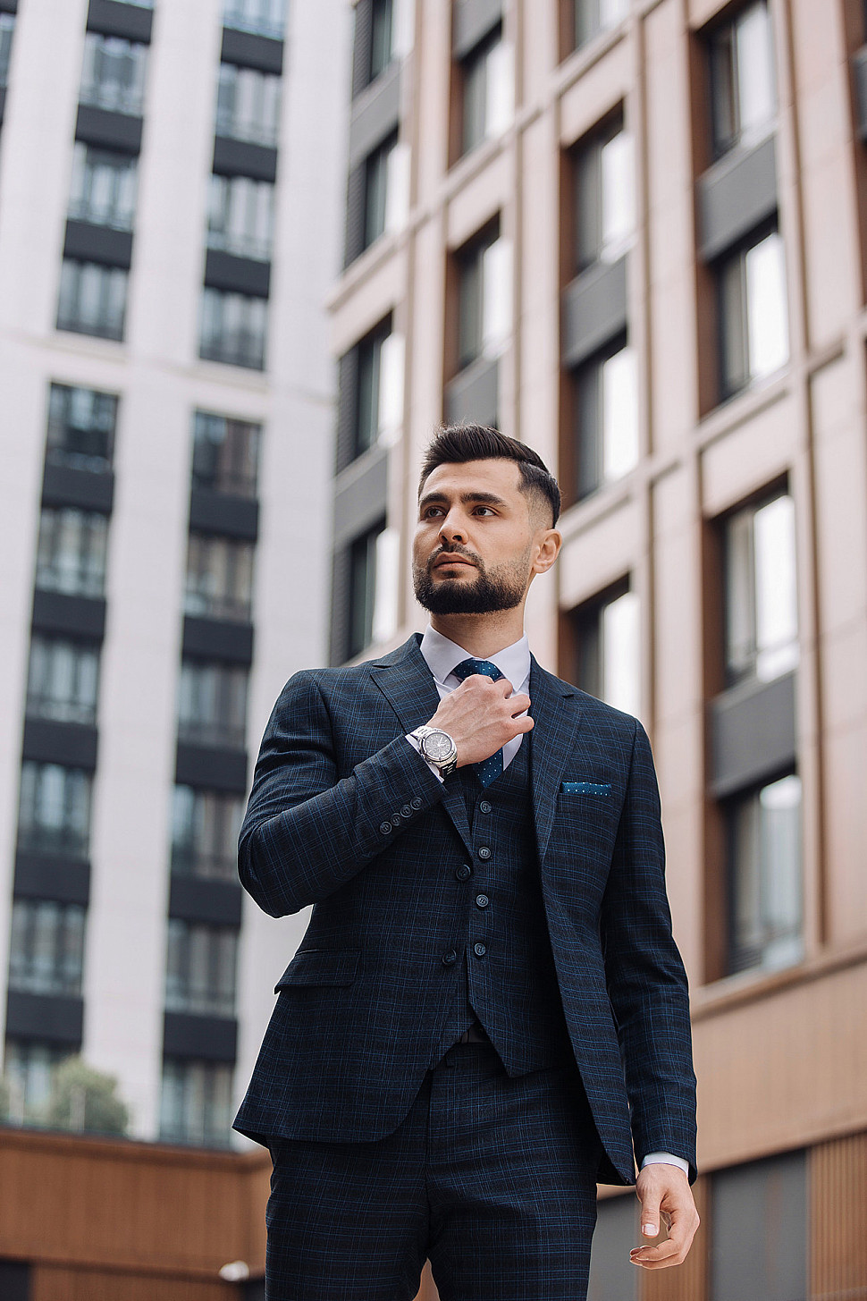 Мужской костюм тройка темно-синего цвета текстурный в клетку