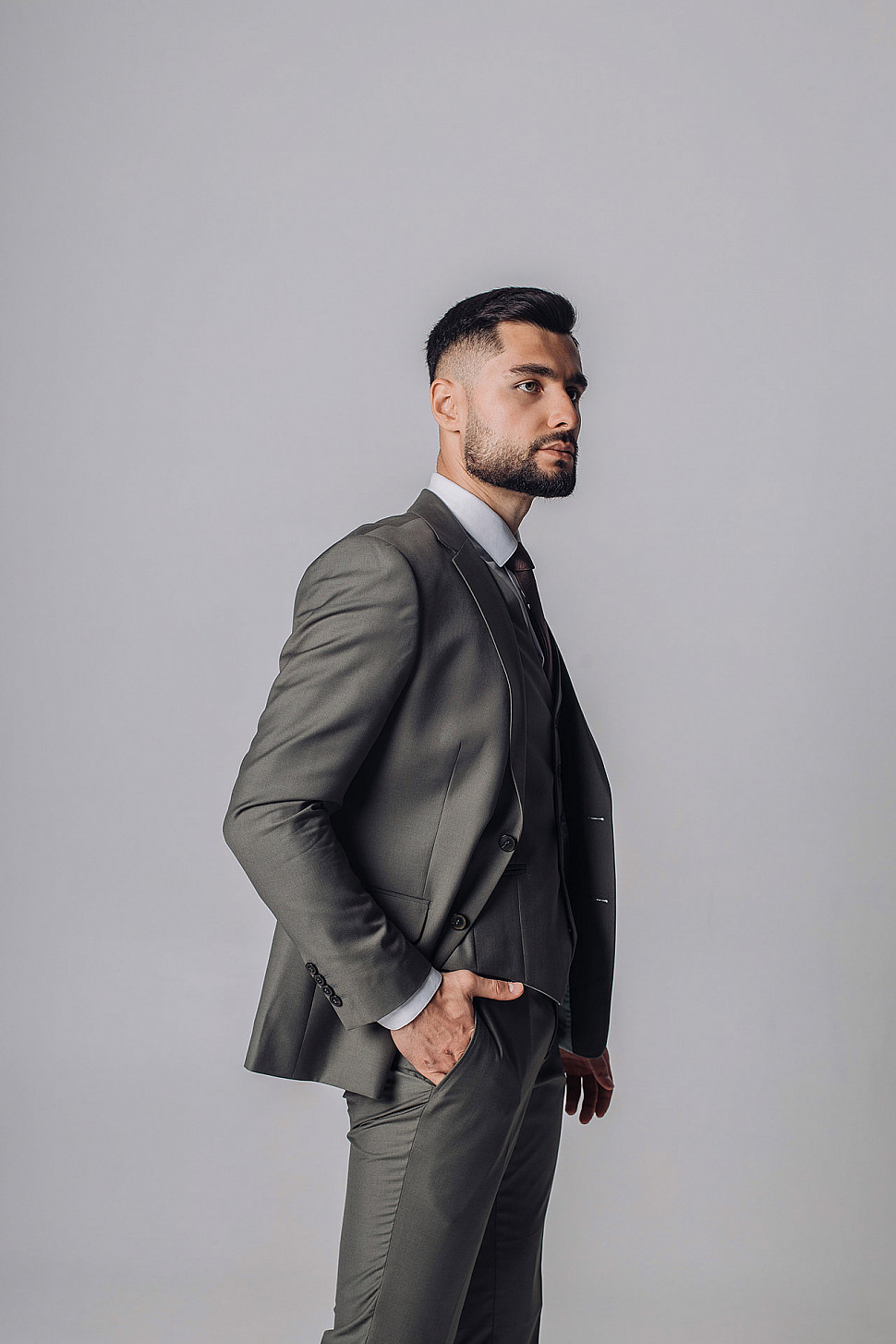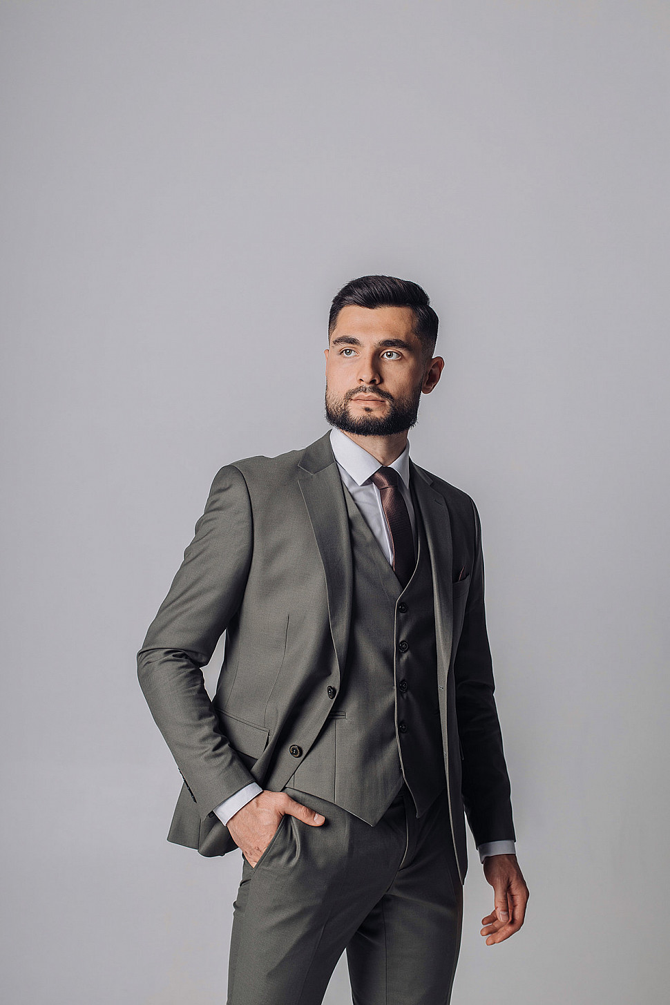 Мужской костюм тройка однотонного серого цвета