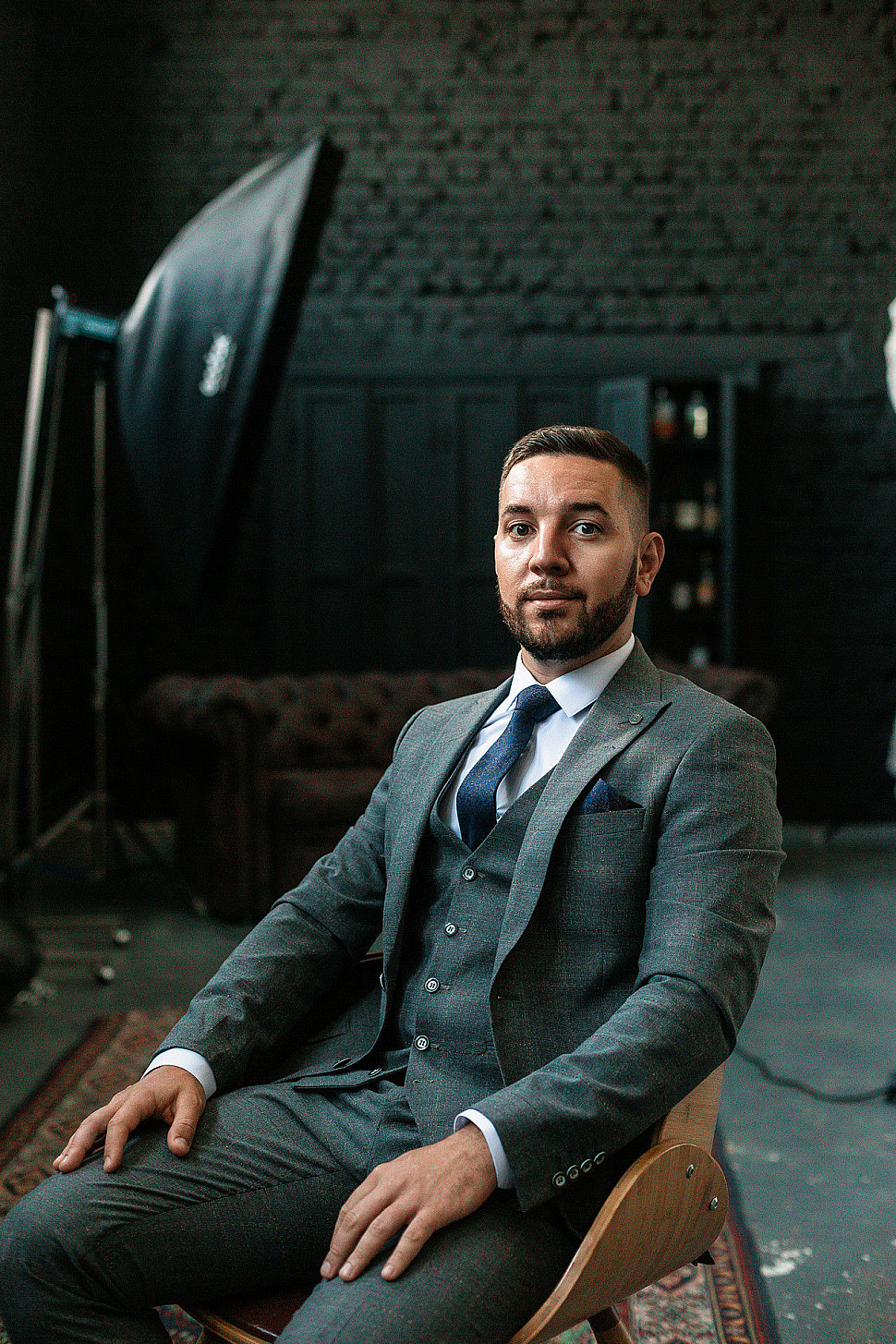 Мужской костюм тройка темно-синего цвета текстурный