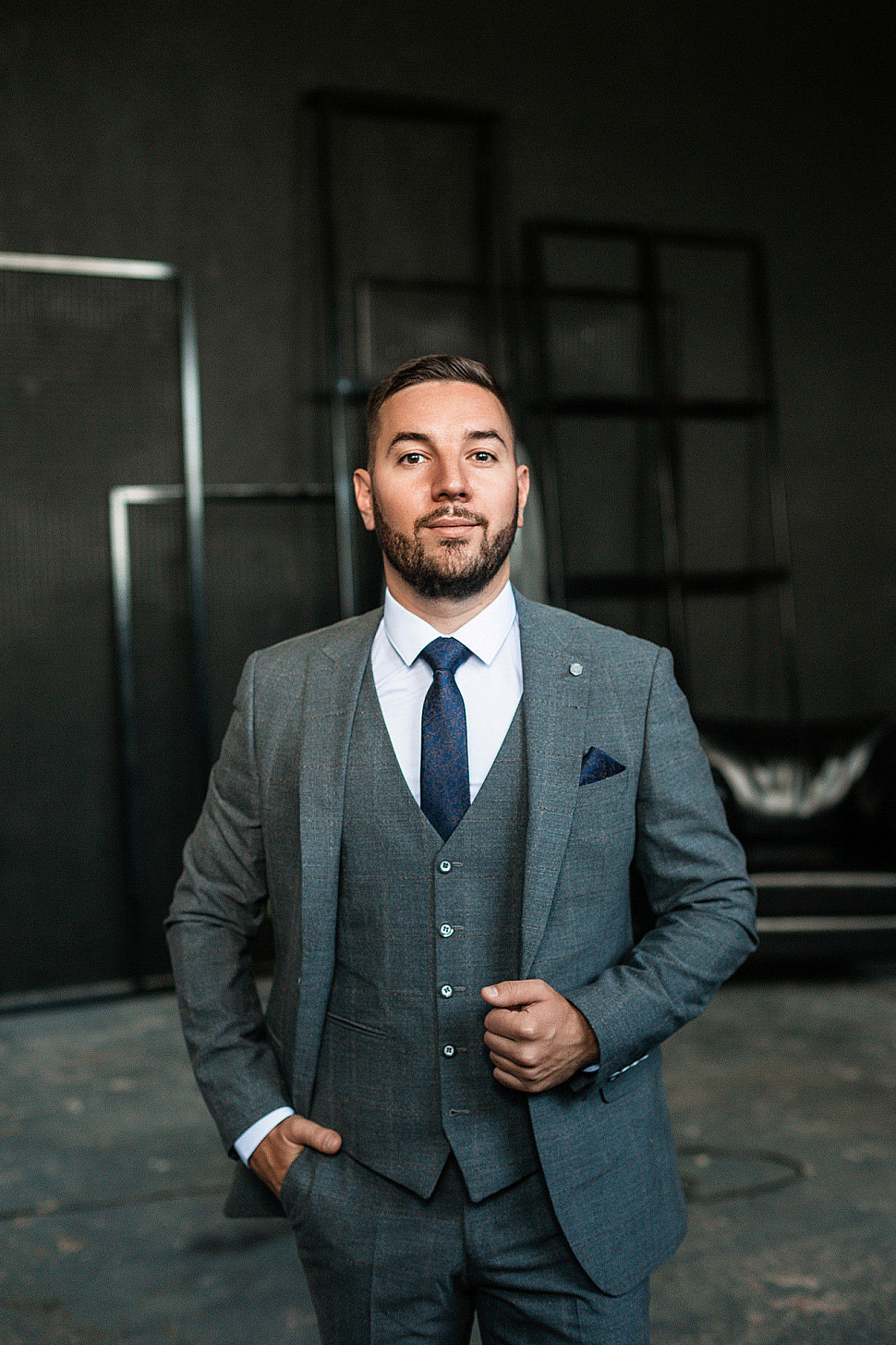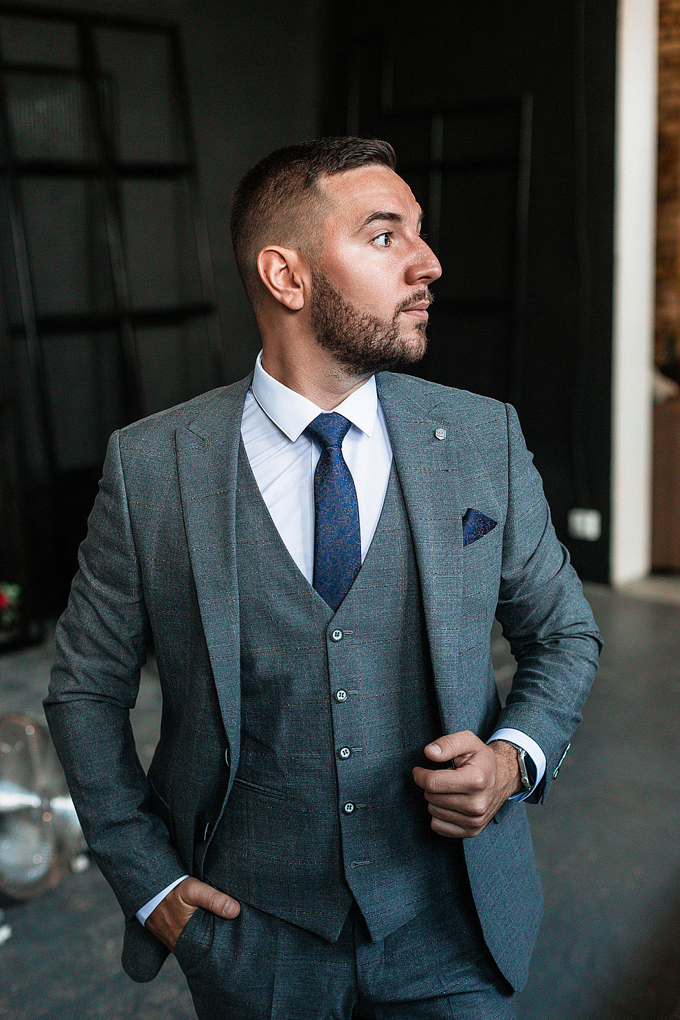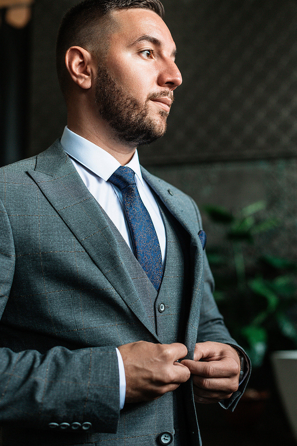 Мужской костюм тройка темно-синего цвета текстурный в клетку