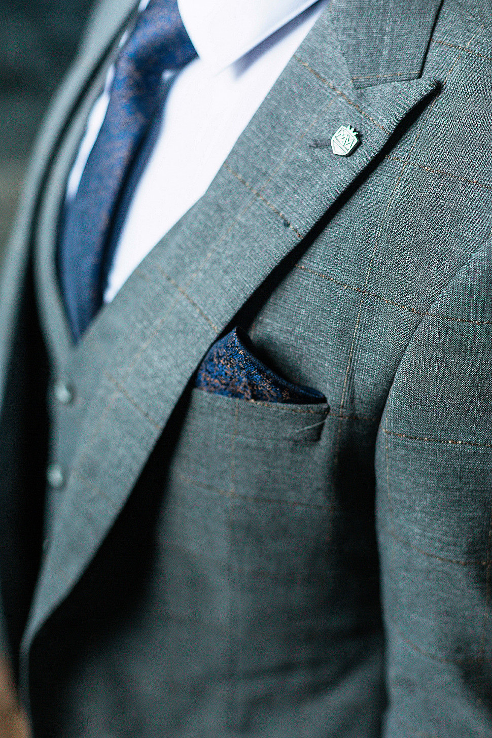 Мужской костюм тройка синего цвета в бронзовую клетку