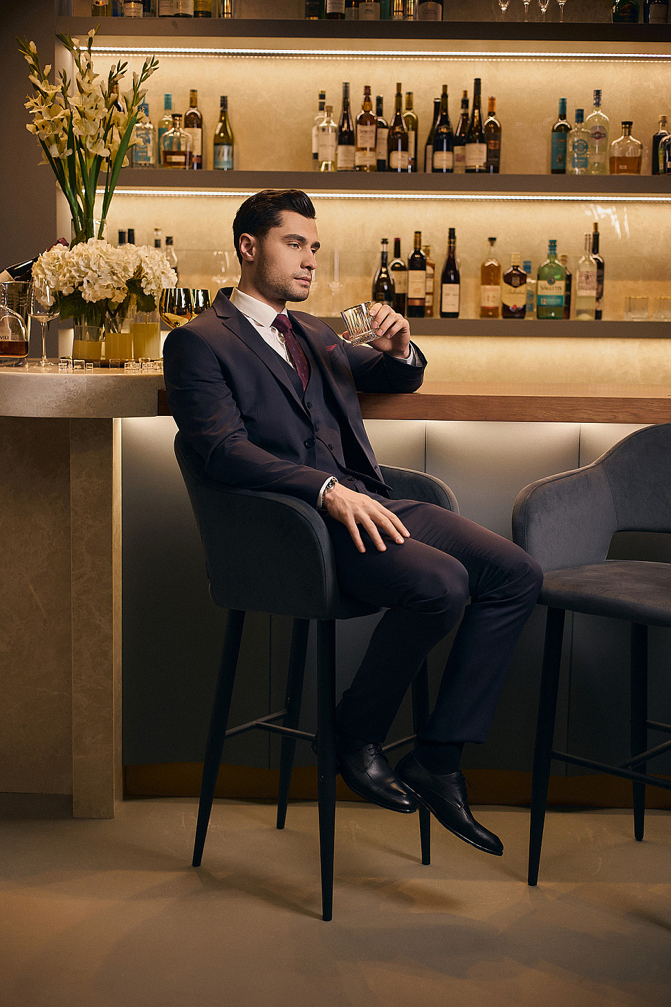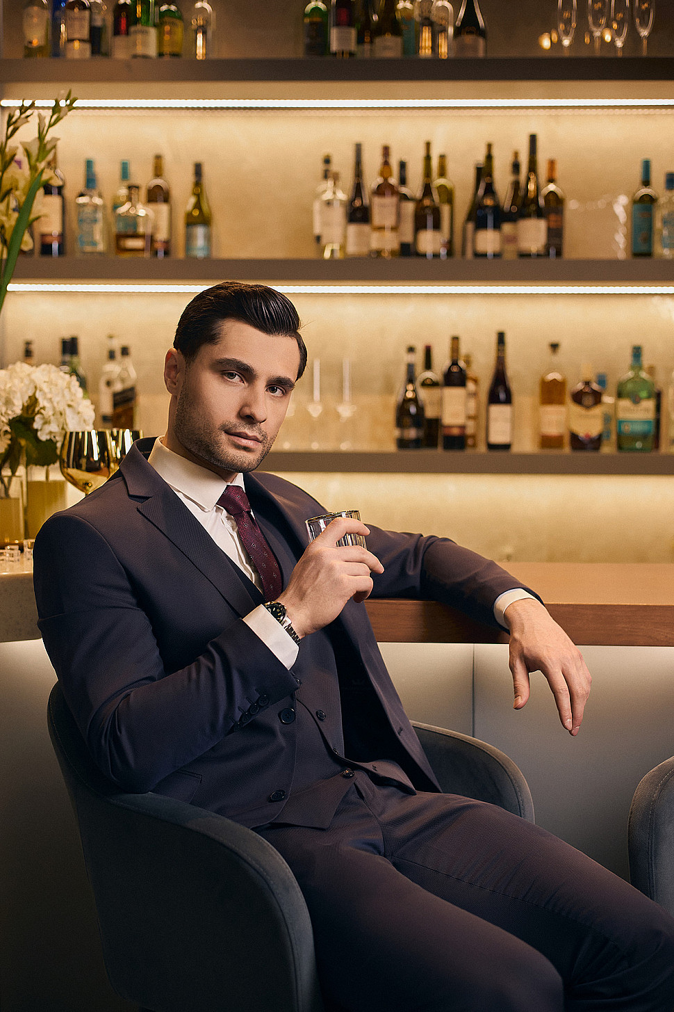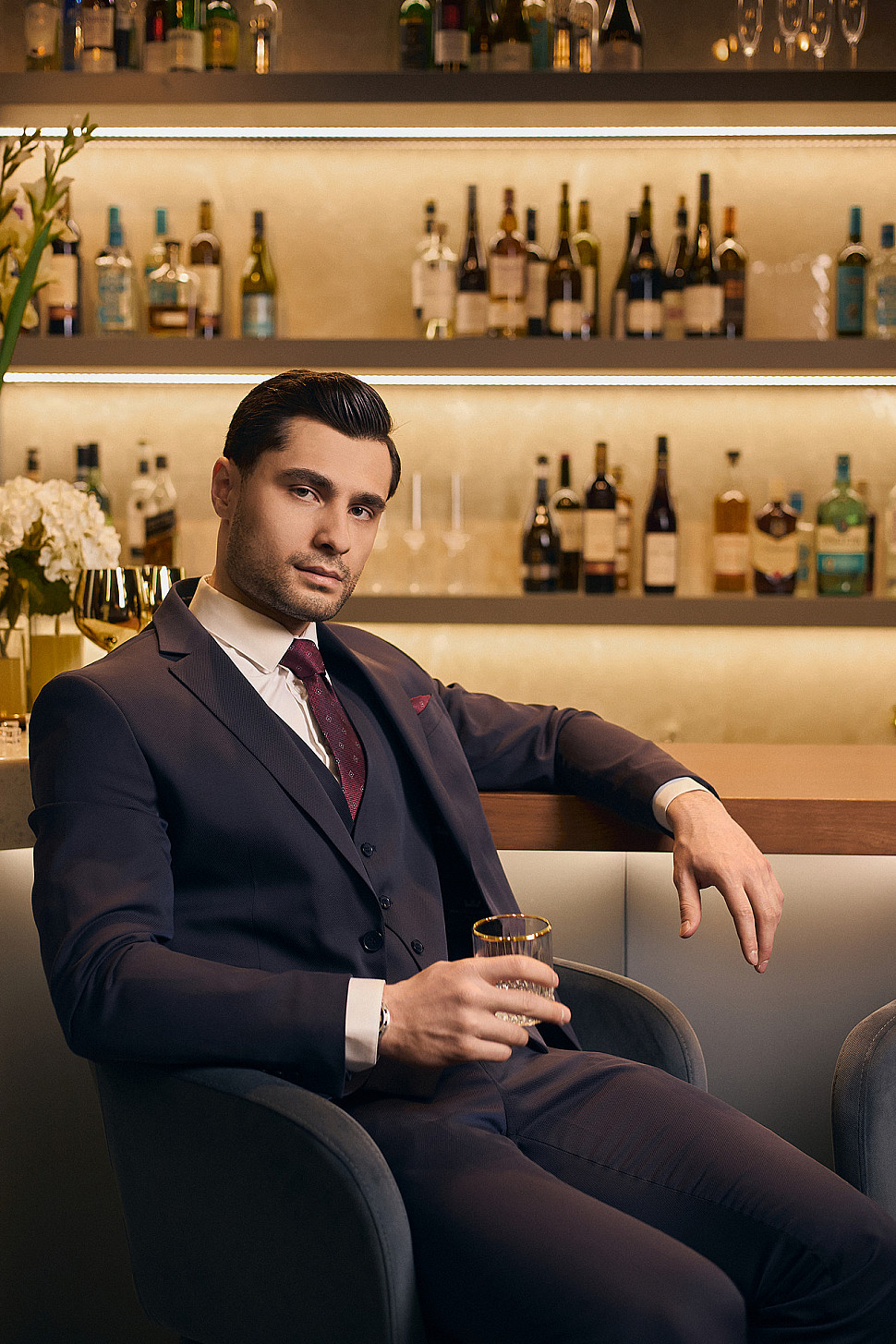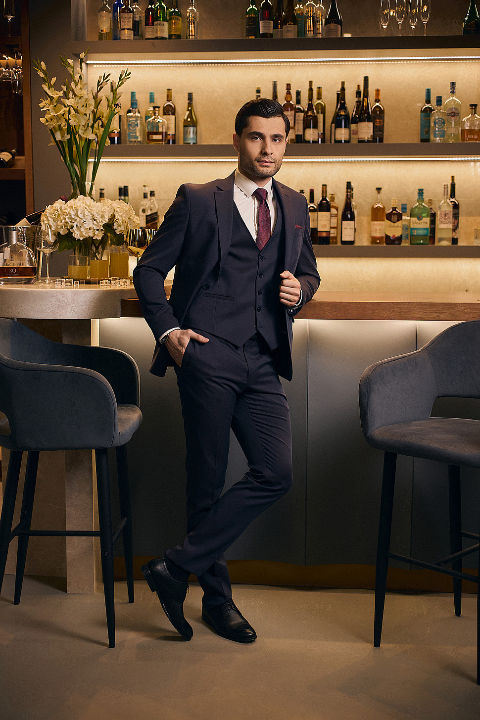 Мужской костюм тройка бордового цвета фактурный